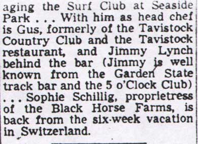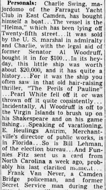 TWO IN A ROW? A $5,000,000 insurance policy, ... A prominent Philadelphia executive, ... a drowning .... Refusal for the public to see the body … And none claiming the policy fund .... Although it's been a few years since, the exec "died" … Ketch on? … A Camden attorney… the state bar ethics committee investigations .... disbarment rumors .... Prominent North Jersey attorney hired to defend .... Recommendations soon. ... allez'oops ...T The prosecutor's office ... affidavit ... charges ... A woman politician …. buying votes ….case not moved .... insufficient evidence... Maybe woman not guilty probably not .... charges anyhow, should be a story .... Two Chicago sporting men .... visit town ... looking over Pennsauken sites…. racetrack rumored .... Horse ... And if they'll amend the law ... Dogs…Business better .... Plenty taxes …. Big Shot politicians… former intimates .... arguments … both want leadership .... open break soon .... Plenty dirt ... This one shouldn't be hard to get. ... "Vince" Martino's Sportland at Wildwood .... Where the original entertainment has startled, even the waves ... GALLOPING AROUND TOWN ON FRANK HANNA'S HORSE The cafe in town that, catered to ·more than,. a hundred persons last Sunday ... :The Blonde in the Fifth ward who is down now (but who was once "the toast of the town” .... A recent gangland shooting (with a Camden man a central figure) which never reached the public prints .... until now .... The new racket boss named Langie [Abner “Longy” Zwillman- pmc] .... who has the boys around Newark puttin' it on the line .... And his threatened invasion of South Jersey ... The Movie Queen who is his Gal ... She's platinum .... hair and jewels ... The former King of Philadelphia's underworld who is broke… And could use a couple of Grand just now ... The Annie Oakley's at the recent opening of a 'new spot. … who wouldn't come back when they learned the brew cost 15 cents for six ounces .... Francis and Mike makin' eyes... A man who signs his name W. Edge recently purchased a piece of ground in Haddonfield ... And right away all of us smart (?) fellas thought Walter Edge was about to 'edge' into Camden county politics .... Have you heard the latest on "I Cover the Waterfront" .... Get your baby to tell you .. "Vas you dere Vic Scharle" has fallen' down on a promise .... five leaves off his orchard.: .. Joe Wells has a new job now .... He’s gonna cut the grass for all his new neighbors in Pennsauken ... But there goes Fitz out on another story .... Probably going to stand up on the 'Camden bridge watching for the crossing of Washington. |