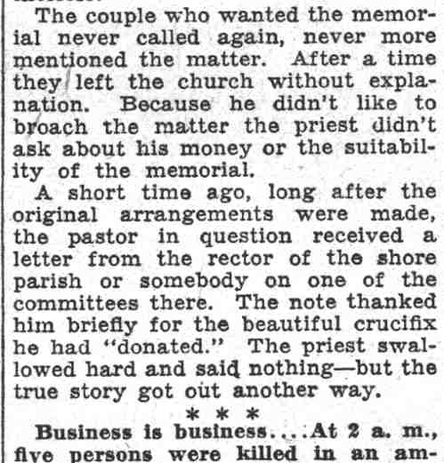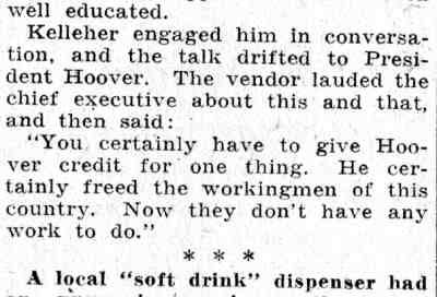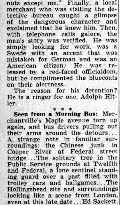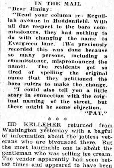 Quite a few Cramer Hill readers were amused at an odd little incident on River Avenue the other day … It appears that an absent-minded driver of a milk wagon was riding, not his wagon, but on a bicycle … His thoughts were probably in Timbuctoo or the South Pole; at least he wasn't thinking of what he was doing, .. For as he started up a hill, on which a number of persons were waiting for a bus, he said some-thing aloud and immediately began to pedal more industriously … What he said was "Giddap!" … A Gloucester reader wants us to toss orchids to the Knights of Columbus council down here … For giving some luxuries and necessities, including soap, cigarettes, candy, cigars, smoking pipes and tobacco to the Gloucester men in the Roosevelt Reforestation Army at Camp :pix … there was enough for the 53 Gloucester "soldiers" and some Camden boys who bunk with them… Well, any outfit that will do that deserves mere than mere orchids … J. C. Kircher of this city, who is motion picture operator on the SS. Virginia plying between Philadelphia and San Francisco, writes to tell us that Francis Lederer, stage star, was on the 1ast westbound trip… Lederer is going to make movies out at Hollywod … Kircher thinks Lederer is '''just a regular He-man" … Believe it or not, city scrip must be becoming scarce … George D. Rothermel, the attorney, declared he had $1400 in cash the other night and wanted to exchange it for scrip … After four days' efforts, he was able to exchange only $1000….. Charity not only begins at home, it sometimes stays there… That, at least, is the impression received from this story which filtered in from a fashionable suburb … where one of the larger families hit by hard times didn't want to go on the relief committee's list of recipients … so the head of the family took his last cash to buy an old car … He went to the shore daily and returned with a load of fish … He retailed the fish and what he had left over each day he gave to the relief outfit to distribute among the poor … The day came when he couldn't make any profit on his fish business, and some of the more fortunate fami-lies had run up huge bills on him, so that about $3OO in all was owed to him … The family was up against it, so it applied to the relief committee for help, … The mother went to the committee for flour, and met with the lofty rebuff, "It's very funny that you have to ask for something when you've given so much, away!" And they shoot rapids… Dave Loeb says someone handed him this card, entitled "Alcohol-A Remover" … It goes like this: "Alcohol will remove grass stains from summer clthes. It will also remove summer clothes, also spring and winter clothes, not only from the man who drinks it, but also from his wife and children. It will also remove household furniture from the house and eatables from the pantry; the smile from the face of his wife, and the happiness from the home. As a remover, alcohol has few equals" … How about the sheriff? . |