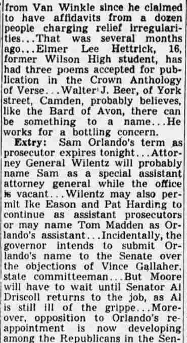 listen... Henry Aitken, No. 1 coal wagon chaser, tried to get Commissioner von Nieda on the bridge commission until Hoffman slipped Baird in...Has the Baird boom gone boom?...That suburban handbill publisher printed that the next time Surrogate Hanna runs for public office it'll be city commissioner instead of a county post because he is weak in the suburbs... The last time Frank Hanna ran, it was for State committee, and he ran ahead of his running mate in every county municipality. Which reminds us that another editor (?) of a weakly newspaper published the forecast last week that Sheriff Joe Van Meter would be the next candidate for sheriff. ..Yesterday the same public misinformer declared he knew all along that a sheriff cannot succeed himself and that what he meant to say was that Joe would run for Congress, the "sheriff" being a typographical error ...The best you can say for those two editors (?) is that they are very apt in printing inaccurate stories of things that do not happen... Incidentally, those weakly newspapers which frenziedly change sides in political scraps after the winners have been announced just for the purpose of getting revenue, are worried about a court decision made recently at Elyria, Ohio...Six sales of foreclosed property were set aside by Judges D. A. Cook and Guy B. Findley because they were advertised in "weekly give-away" publications ...Said the judges: "A search of the authorities disclosed no case in which a hand-out and give-away sheet has been deemed a newspaper of general circulation." * * * DOWN at the Lakeland farm the help cut down the hay in January and didn't put it in the barn until Feb. 2...It should have been harvested last Fall... That anti-saloon fight in the Eleventh ward is about to break out anew... After ousting the saloonkeeper at Thirty-fourth and Westfield, they are circulating petitions to prevent him from transferring his license to any other spot on Westfield avenue.. .The Victor Scharles (he is the amiable registrar at the county election board offices) are getting ready to pass around the cigars... When the faithful and loyal threw that birthday party to Harold Hoffman in New York the other night, Paul Wendel happened to be in the same hotel...They didn't meet...The "numbers raid" in Merchantville is another attribute to Chief Bill Linderman and his on-the-toes police department.. The irony of it, however, can't pass notice...The pinch was made within a few blocks of Justice Lloyd, who before his recent retirement caustically criticized numbers and other gambling racket elsewhere... By the bye, there was no end of excitement in Merchantville the other evening when constables, after considerable ado, levied on the furniture in one of the fashionable suburb's show places... When will somebody renew the lights on the minute hand on the west face of the City Hall tower clock?.. .Mrs. Madeline Salvatore, former county committeewoman from the Fifth ward, is a grandmother again...Her daughter, Jeanne (wife of Dr. Anthony Di Marino, of Paulsboro, and former secretary to Lou Hoffman at the city tax office) gave birth to a girl, Tonia, at the West Jersey the other day. * * * * * * A REAL ESTATE friend of ours called at a house to collect rent from the tenant, and tells us of a new low.. .The tenant complained something like this: "I'm out of work, I've sent my wife and two children back to the wife's family, and if things don't break right for me pretty soon I guess I'll have to get rid of my car".. .Speaking of cars, Charlie Powell (retail stamp window at the post office) who has one of the first cars made, got through the auto inspection... Sgt. Dewey Parker and Special Officer Joseph Siddone are animal lovers...But only up to a certain point...They found a rabbit lying dazed near the Audubon High School this week and solicitously put it in the rear seat...When Brer Cottontail regained consciousness, he bit and scratched Siddone so badly that the cop later had to go to a doctor... That bunny must be laying for an innocent fox somewhere (he escaped from the car after overpowering the two officers)... The publicity man for a certain cement trust should be a little more careful about mailing notations on letters he writes for other folks... The letter he wrote for stan bleakly had the notation: "Stanley: Please send this off if O.K.".. .Stanley thought it was okay and sent it off ...But forgot to erase the note, Larry... The new edition of the Who's Who in America Jewry" lists eight residents of Camden among the 10,140 Jewish notables in Camden, to wit: Bernard Bertman, A. M. Ellis, Dr. Hyman Goldstein, I. B. Levine, Herman Natal, Rabbi N. H. J. Riff, Leon H. Rose and Samuel Shane. |