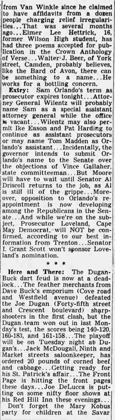 of Farmer Baird is trying to make something of Freeholder Bart's contention that it costs $1.65 to produce a dozen eggs at the county farms .... Will Farmer Baird tell us, as a noted breeder of stock, how much it costs the county to by milk for the county institutions?' ... And why? . * * * UNDER election laws, the naming of members to county election boards is quite simple .... In each county, the state committee members and county chairman for each party recommends a name to the state chairman .... The state chairman APPOINTS the county board members and sends their names to the governor merely for commissioning .... The governor has no choice but to issue commissions to the state chairman's appointees, provided the names of those appointees are in the governor's hands before March 1 .... Former Governor Hoffman (Boy, doesn't that sound good!) once ignored State Chairman Jeffers' appointments and made his own on the plea that he didn't receive the names before the deadline .... Governor Moore has this year's appointments this week from State Chairman Clayton Freeman ... But don't be surprised if Governor Moore refuses to recognize Freeman' as the appointing authority and instead, interferes with Republican factionalism on behalf of Hoffman, .. By the bye, the Guy Named Joe tells us that Freeman absolutely gave George Walton's (Haddonfield) name to Governor Moore as the successor to Bill King ... And when the Democratic list of appointees is given to Moore, the successor to Charles Clark on the county election board will be John Trainor of Haddon township ... Burlington county Republicans are puzzled, and plenty disgusted, with Cliff Powell's pro-Hague attitude ... If Cliff thinks that Hague and Hoffman will help him in his 1940 drive for Governor, he's all wet, and his own county is going to tell him so ... Hoffman has told everybody who will listen that he himself intends to run for Governor again in 1940 ... And South Jersey Democrats are excited about the reports that Damon and Pythias are no longer the best of friends ... We mean that Johnny Malone is sore because Frank Hague went South and left Johnny holding the bag during all the election probe fuss ... Malone is a pretty smart politician, having learned a great deal as Second Boss Man of Jersey City, and if he definitely breaks with Hague, he'll find plenty of support in this end of the State .. We also hear that House Speaker Pascoe won't run against Senate President Loizeaux for the Union county senatorial Republican nomination, after all ... He will be given a congressional vacancy (that doesn't exist yet but will when another judgeship is handed out) and will run for the next full term of Congressman ... Newark papers may copy. ..... BILL GOTSHALK, former assistant prosecutor and Fall Guy for the ridiculous councilmaniac bust, told the folks at a service club luncheon this week that he doesn't see why such columns as humes' and Fitz' are published … What are you afraid of, Bill? .. Aside to Frank Stetser: Define the word "Communicate" ... The Daly team should and will walk off with first prize in the dart tourney ... Prosecutor Howard Eastwood and County Detective Cliff Cain, of Burlington county, are in Florida trying to extradite a man under indictment on illicit liquor charges, but they're probably secretly thanking him ... For being pinched in such a nice place as Florida at such a time of the year ... Mrs. Elvina Carson, of Paulsboro, claims to be one of the youngest grandmothers in the country, .. Her first great-grandchild was born when Mrs. Carson was 53 ... Recommended for your diversion: "Happy Landing," the savar fillum ... "brother rat" the Locust stage attraction ... Millard Allen sitting to one side and refusing to speak to his two fellow Camden Assemblymen ... A glass of Camden bock ... Charlie Humes trying to get out of the ping pong league cellar ... Any of the Duseks against any of their opponents. |