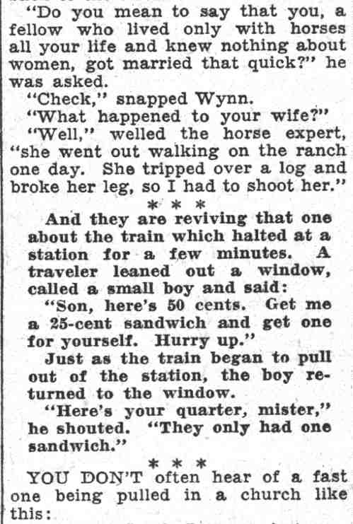 When a young man is in love, he thinks that nobody in the world is good enough for her except himself. *** HEARD via the radio: "This fellah Columbus, now, He'd be a sensation in the automobile industry today." "Why?" "Because he went a couple thousand miles on a galleon." * * * AND this one: " 'S funny how we carryon traditions in honor of men who are dead and gone." "Howzat?" "Well, Lincoln united the land, so we are staying united; Washington freed the land, and we are staying free, and Columbus was glad to see dry land, and they are keeping it dry!" ** * Signs of depression In South Jersey: Maple Shade police department repairing its only fly swatter in preparing for next Summer's flies … More lawyers getting ambulance chasers … train fares down … knickers with new suits … Certain special officers, who get paid only when they make arrests, pinching more and more motorists … Motorists coming back for a hearing rather than forfeit cash deposits … Jail becoming filled with "non supporters" who can't raise the bond imposed on them … Fewer plans for Halloween… wood fires and empty coal bins .. The price of gin dropping until they almost give it away …. baggy knees. * * * OVERHEARD in one of the county libraries recently: Reader: "Do you have Henry Fielding's 'Tom Jones'?" Library Employee: "I don't think so but I'll look," . Library Employee (after looking in the file): "Are you sure you have the right name? Are you certain that it isn't ‘Thomas Jones'?" * * * What fraternal lodge has had “Check and Double Check" marks printed on its stationery? …Still those New York burlesque show ads are funny … The latest is the bill for attraction advertising "Henrietta Ham from Virginia" … What scribe had a cold the other day and after taking pills all day remarked that he felt better? … To discover that they were rheumatism pills … There was an awful uproar in political circles in a suburban town last week, because of an error … One political outfit had a sign painted containing the names of its two local candidates … The sign also bore the names of two officials of the opposite political faith endorsing the two candidates … Endorsement had not yet been obtained, we are told, but the sign was ordered in anticipation of approval … The sign painter was told to deliver the sign and place it face against the clubhouse … Instead, he put it face out where everybody could read it. Supporters of the two officials gasped in amazement … Later, some one went out in all the rain and cut out the names of the two "endors-ing" officials … What two Philly de-tectives come to Camden nearly every day and park themselves in front of a bar to "get away from it all”? … What Philly police inspector called Director Schofield up and down, and got away with It? … We know a fellow who can cat more than Charley Humes, and he's almost skinny! … That joke about Columbus left out the fact that he'd be a remarkable man if he were living today? … Because he'd be almost 500 years old. |