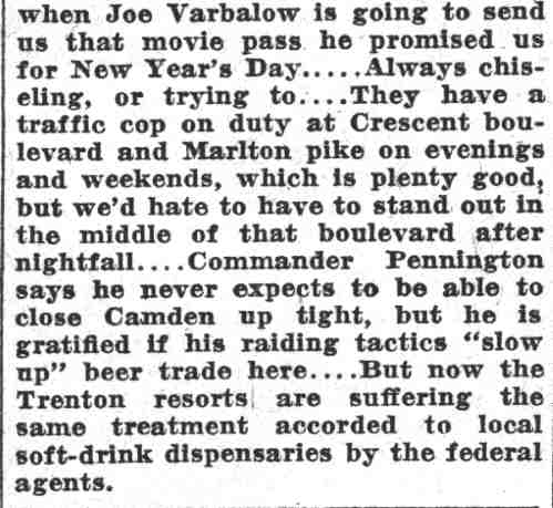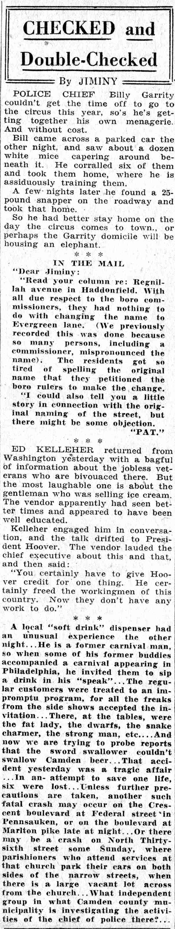 Twenty-seven of the 142 so-called "soft drink" establishments which were granted a Camden license for 1933, were raided by federal agents during the past year. . . So who was the mayor who said some months ago that Camden was beerless? . . . By the bye, speaking of federal agents I reminds us of this inside stuff . . . Despite "hedging" statements from Washington, the personnel investigator Prohibition Administrator Amos W. W. Woodcock has recommended that Agent Ira Harris be dismissed from the service . . . He is under suspension, as you know, accused of taking a confiscated cash register from the federal warehouse without permission from superiors. . . The depression goes up everybody's alley. . . A prominent South Jersey man was visited by a bill collector the other day. . . Seated among costly furnishings in his lavishly equipped office, the executive of the company told the collector he had lost a million iron men in the last year . . . And couldn't attend to the bill at this time . . . The bill, incidentally, amounted to something in excess of $100 . . . For cigars . . . Chief of Police Walter Miller, of Riverton, has been looking forlornly gloomy for a week, and everyone wondered why . . . Well, the cat's out of the bag . . . Somebody stole his prized Persian. cat. . . And as far as he's concerned, we'll bet, the police business can go to the dogs until he finds the culprit and recovers his pet. . . And Sid Kaplan is back on the job after an operation . . .. He was divorced from his adenoids and tonsils . . . Which is the first time to our knowledge anyone ever took something away from a lawyer and made him pay for it . .. If you want to forget your troubles for a couple of hours, amble over to the Chestnut and watch Paul Muni perform in "Counsellor-at-Law" . . . If you prefer the flickers, there's "Farewell to Arms" at the Stanley in Camden or "Rasputin" at the Aldine . . . Either one is a sure bet. . . And here is an odd and tragic situation . . . A deserving man of our acquaintance who has been unable to get work for these many months tells us that he cannot get any help from the relief outfit because he has an equity in his home . . . He owns a house. and yet can't eat . . . But he'll be losing the home soon, perhaps, and then he won't be numbered among the taxpayers anymore . . . And it is the taxpayer who keeps a town on its feet, even if it does stagger into the ropes. . . We have been wondering whether the home owner is not just as deserving, if not more so, of temporary relief as those who rent or have no homes at all . . . After all, someone has said somewhere that the small home owner is the backbone of the nation . . . Now that the Sunday baseball boom is well on its way towards realization in Pennsylvania, isn't it high time that somebody of consequence started a similar campaign in earnest over here in New Jersey. . . Not only for sports, but for Sunday movies . . . "Of Thee I Sing," the musical satire on American politics which is to come to Philadelphia Monday, was playing in Washington the other night. . . Vice President-elect Garner was with some friends in a box . . . He took huge enjoyment out of the role of the forgotten vice-president . . . When one actor depicting a political nabob, asked, "What was the name of that fellow we nominated for vice president?" Speaker Garner threw back his head and roared with laughter . . . Incidentally, Victor Moore, the comedian who portrays the role of vice president in the show, formerly lived in Hammonton. |