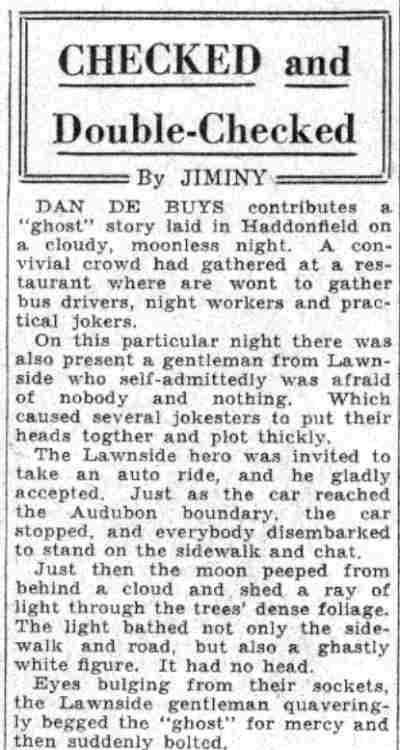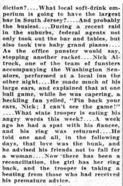 THE FIREMEN of that· particular town are plenty bothered about it all. We refer to that incident the other, day when a field fire threatened several homes, A woman telephoned, not the firemen, but the police department of the adjacent town. The police then called the cops of the town in which the fire was burning, but merely said that "there's some trouble over there". An officer was sent to investigate, and then he called the firemen. So that just 12 minutes elapsed from the time the woman called until the firemen arrived, because of the roundabout way of giving the alarm and the crossed reports of what was wrong. Therefore, the woman soundly upbraided the fire-men for being so tardy. The firemen feel that this was unjust, particularly when they learned, they allege, that the fire was started by the son of the woman who called the cops. * * * There was quite some speculation in our own fair city, where the cops are now on their toes. A truck driver left his vehicle almost in the center of the street while he went into a restaurant to grab a bite to eat. A cop gave him a ticket, and rightly so, because the truck hindered traffic. However, while the cop was handing out tickets, he might have given one to the driver of that beer truck which was parked in front of a nearby fireplug and facing in the wrong direction. But he didn't. , * * * If O. O. McIntyre can do it, what's to stop us? We mean mentioning the name of a town or city, and then writing the first thing that pops into our mind in association with the burg's name. For instance, whenever the town of Hopewell is mentioned, we'll always think of the Lindbergh kidnapping. If the city of Trenton is mentioned, the first associated word that comes to us is "speakeasies." Atlantic City reminds us of sunburn and Mickey Duffy murdered, and so on. Let's go: Camden, beer; Collingswood, Sun-day Blue Laws; Clementon, open Sunday; Maple Shade, whoopee parlors; Lakewood, gambling; Marlton, harvest home fetes; Blenheim, Mary McClyment and the bouncing bullet; Bellmawr, roadhouse paradise; Magnolia, the former beer garden grove; Somerdale, apple cider; Laurel Springs, watercress; Mt. Holly, Ellis H. Parker; Lindenwold, cinder jabs; Kirkwood, old Lakeside Park; Pine Hill, weekend parties; go slow, state police barracks; Juliustown, a real country general store; Medford, the Vaughns and the Klines; Wrightstown, soldiers; Bordentown, a dry spot; Roebling, bootleggers; Moorestown, aristocracy and tough on speeders; Jobstown, Sinclair stables; Pitman, where South Jersey's second best checker played lives; Masonville, plenty of Masons; Pine Valley, where a golf club is a borough: Rancocas, the rum barge scandal; Chatsworth, Emilio Carranza killed in plane crash; Atsion, Rider murder case: Lakehurst, dirigibles; Hainesport, liquor parties; Pennsauken, political battles; Gravel Switch, snake hunting; Ong's Hat, one-house town; Millville, grown-up mosquitoes; Vineland, poultry and the Lilliendahl case; Ship Bottom, rough surf; Beach Haven, clam treading; Tabernacle, cranberries; Haddonfield, tree cutting; Merchantville, chicken dinners and scrapple breakfasts; Long Branch, Stanford White;. Rumson, millionaire's homes; Atlantic Highlands, rum ships; Pemberton, one-man regime; Riverton, investigations; Palmyra, beer drop; Fortescue, fishing; Turnersville, the former fining mill; Chews Landing, Woods' murder; Barnegat, light-house; Mt. Ephraim, where if they fire a cop there would be no police force; Williamstown, smoked ham; Haddon township, Jack the Hugger; Cape May, swell beach; Pennsgrove, man-sized fires; New Brunswick, Hall-Mills; Blackwood, bungalow parties; Elizabeth, federal agent murdered in brewery raid; New York, swell floor show at the Hollywood, plenty of bright lights and whole reams of paragraphs; Ashland, where firemen were late for a blaze because somebody stole the gas out of the fire engine; Glendale, Walt Whitman's former home; Toms River, Hattie Evans' trial; Bridgeton, rum scandal; Ocean City, tent city; Woodbury, Rose Sarlo case; Pedricktown, enough explosives to blow South Jersey off the map; Gloucester, saloons and old race track. And now watch a lot of Chambers of Commerce burn up. |