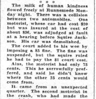 What justice of the peace in the Black Horse pike sector is giving away rodents? ... That is to say, he put a mouse on some fellow's eye a few days ago .... And the gentleman who is now wearing that shanty is a cop .... Speaking of cops, there's the Beach Arlington feller who blows his whistle for the pure enjoyment of it.... And stops every motorist who dares go over 25 miles per hour on the island road .... And when he drives his little coupe around a corner onto the main highway, we wish he'd look to see if any traffic is coming ... Because we nearly knocked him off the road .... While
