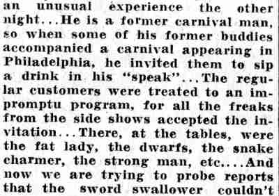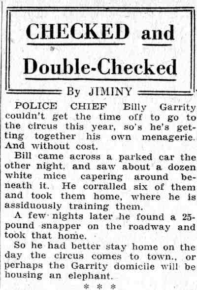 State police have just received orders that they cannot have pets of any kind at their barracks. Well, maybe the state cops don't know that every police force has its pets. * * * We sure started something by printing that "Casey Run" practical joke. James Thompson, of Penn Street, who had an illusion show on the road, said it is a favorite joke with show people, who knew it as the "Mamie Party." Thompson's victim was a six-foot ox named Ben who joined the show at Watertown, N. Y., and knew only one sentence in the English language was "When do we eat?" So at Carthage, Thompson and the others decided to get rid of him. But here let Thompson tell it: "We framed a 'Mamie Party' with a country store 20 miles down the road. That night he buys candy and fruit for a girl we've to introduce him to so he can take her on a party with us. After the show, we all went down to a house. When we get there, we tell him to knock on the door and ask for Mamie, which he does. One of the crowd planted inside opened the door and shouted, 'So you're the guy running around with my wife, eh?' and starts shooting. The goof starts running, and at the corner of the house, two more men start shooting. "Two days later he shows up, dirty and scared stiff and starts telling us about it. One of the crowd goes uptown and gets a state trooper. We also had an office in which to hold court. The trooper places Ben under arrest for the murder of the woman's husband, and the big lummox starts bawling that he is only a poor country boy and not a show feller. We all went to court with him, and you should have seen that court. "Finally the judge sentenced him to be hanged at daybreak and Ben fainted. We were scared, thinking he had died of fright, but he soon came to. However, I helped him to 'escape' through the window. When he got outside he hugged me and thanked me for saving his life. He didn't stop for his suitcase or fishing pole, but just took it on the lam and never stopped. We never saw him again." * * * THEY tell us it happened, though you can't believe everything you heat· or read-in columns such as this. A local banker called up a local garage proprietor and asked for payment on a note. "I don't have the money," was the debtor's reply. "Let me have more time." "Can't do it," was the reply. "We want the money; it's overdue now." "Yeh, I know," groaned the garage man. "Say, were you ever in the garage business?" "No," denied the banker. "Well, you soon will be if you don't give me that time extension." * * * Dr. Vilhjalmur Stefansson told the teachers here the other day that the mosquitoes in the Arctic Circle are worse than the Jersey skeeters … We've heard that before, and the reason probably is that they go hungry so long because there aren't as many people up there … Because roadhouses are fewer … Although j. l. buck, East Camden naturalist and game hunter, says that the snakes, poisonous insects and dangerous animals in Africa don't bother him as much as Jersey mosquitoes … there is more danger here from automobiles than from natives or animals in Africa, Buck told us … Moreover, the natives over there wouldn't think of stealing, the hunter alleges … Lots of people over here steal without thinking, too, … The jails are full of them … But maybe there's nothing worth swiping in Africa … Labor is cheap .and gasoline is high there … Also here … Because we hear that a South Jersey factory is employing men for 15 cents an hour … Ten hours a day … $1.50 a day pay … All is quiet on gangdom's front…. For a couple of weeks, anyway….. Don't get a crush on the girl you're dancing with at the Ambassador Club's masked ball on the 30th in Convention Hall … She might he a he … Steve Kirby is reported negotiating with some female impersonators to flirt with South Jersey sheiks … but not to enter the perfect form contest. … By the by the new law firm of Orlando and kisselman has the most sumptuous suit of offices in town.. |