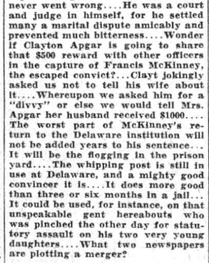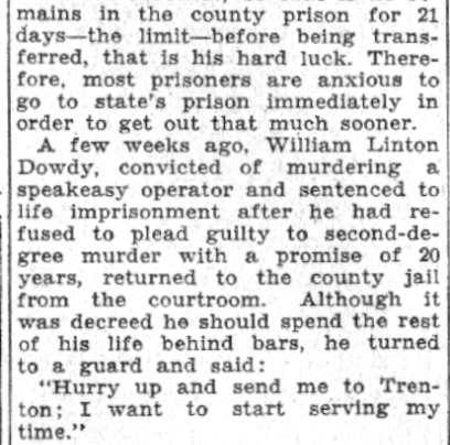 industrial boom we've heard reported that one of A member of the camden elks best known as "van" was sitting in the clubhouse the other evening when he dropped his new straw hat on the floor .... Along came Howard Ledyard, who tips the scales at something like 200 pounds ... He was about to pick up the hat for Van, but the latter jokingly said, "Don't bother; step on it" " .. We hate to tell the rest ... Howard took him at his word ... And stepped on it .. Civil war ... Some of the Black Horse pike boys went fishing at Reed Beach a few days ago ... Trooper Eric Hossack dressed like a fashion plate, fell overboard ... Joe Toterella and Squire Schragler of Ashland, lay on the bottom of the boat during the entire trip, interested in nothiing but dying ... But Doc Warren Pinner, of Runnemede, had all the fun , .. He felt a tug on his line, and often, during his half-hour battle to pull his haul aboard, he jubilantly told his comrades he had hooked a drumfish ... He finally managed to pull his catch, out of water ... It was the boat's anchor ... And now he intends to stick to pill chasing .... Golf .... Up at the Burlington county jail in Mt. Holly, a big police dog is let loose in the prison yard every night to give warning if anything unusual happens ..... But last Saturday night, instead of being loose in the yard, he was kept indoors .... That was the night Eddie (Jimmy Valentine) Adamski escaped ..... That joke about street corners formerly occupied by saloons and replaced by banks, now being occupied once more by bars, is not really a joke out in the Whitman Park section.... For a building occupied formerly by a branch bank is now a saloon ...... Fid Gordon, the well known comic fiddler, heads the Walt Whitman Theatre's vaudeville bill tomorrow and Saturday, thanks to Manager Joe Klein, who knows his stuff ... What