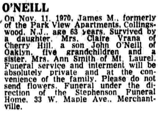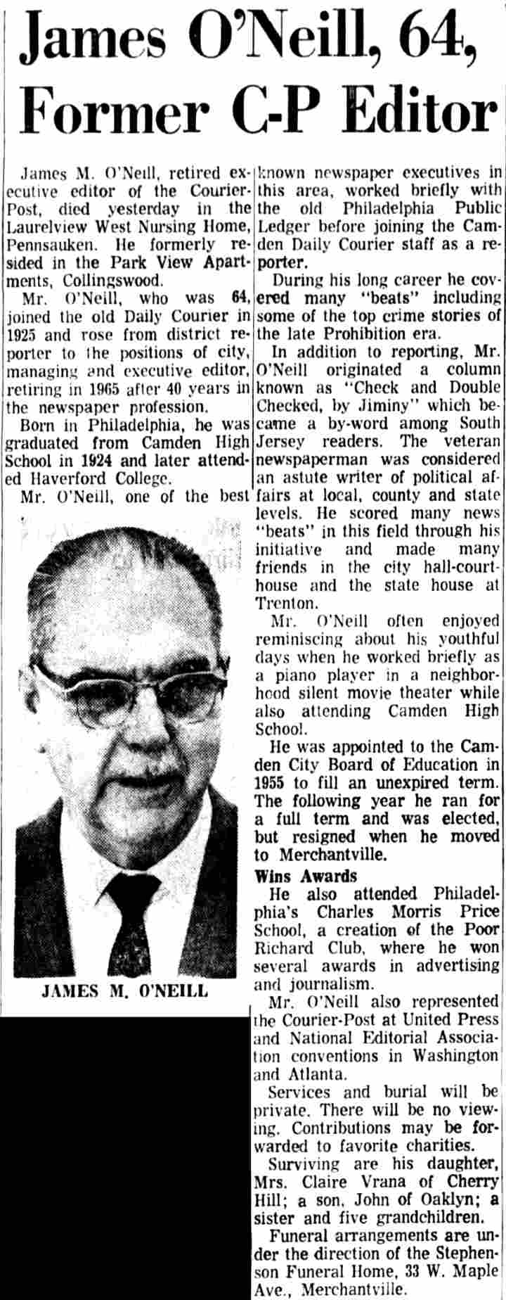 JAMES M. O'NEILL worked as a reporter, columnist, and finished his forty year career in journalism as the executive editor of the Camden Courier-Post. He was born in Philadelphia, and graduated from Camden High school in 1924. James M. O'Neill briefly attended Haverford College before taking a position with the Philadelphia Public Ledger in 1925. He soon moved to the Camden Daily Courier, and was kept on when the Courier and the Post-Telegram newspapers merged. During the 1930s and 1940s his column, "Checked and Double Check" by "Jiminy" gave readers the "inside scoop" on Camden politics and other things. The 1947 Camden City Directory shows him living at 501 Cooper Street in Camden. He served as a member of the Camden Board of Education in 1955 and 1956, but resigned when he moved out of the city. On April 3, 1954 a banquet was held at Kenney's restaurant on Market Street in honor of retiring Camden Police Department detective August Pfleiderer. Joseph Mardino chaired the committee which put the banquet together. Other members of the committee include Clifford Carr, Harry Tracy, George Ellis, Nathaniel Jones, James Mulligan, Russell Maurer, Samuel E. Johnson, Edward C. Garrity, Frank H. Ryan, James M. O'Neill, Stephen M. O'Keefe, Edward J. Quinlan and Joseph Webster. During his time in Camden, he was on a staff that featured many fine columnists, including Ben Courter, dan mcconnell, Charley Humes, and Gordon Mackay. He retired from newspaper work in 1965. James M. O'Neill passed away on November 11, 1970. |