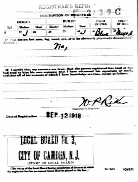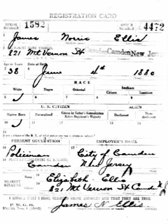 James Norris Ellis married around 1901. His wife, Elizabeth was at least a dozen years his senior, and the couple never was blessed with children. The 1906 City Directory shows him working as a driver and living at 821 Mount Vernon Street. The 1910 Census Census shows the couple at the same address. He was then working as a laborer at an iron works. The couple was still living at that address when the 1914 City Directory was compiled. James Norris Ellis had been appointed to the Camden Fire Department by August of 1912. He served for four years, then went over to the police department, where he served for 17 years before retiring on pension in 1933 October of 1932 In 1916 James Norris Ellis had been appointed to the Camden Police Department. James and Elizabeth Ellis were still living at 821 Mount Vernon Street. The 1920 Census shows that they had moved to 776 Walnut Street. They were still living at that address in April of 1930. By that time he had been promoted to the rank of detective. He retired from the police department on October 1, 1932. During the 1930s Elizabeth Ellis passed away, and James Norris Edward remarried. He was living with his second wife, Marie, at 1119 Princess Avenue when the 1940 Camden City Directory was compiled. On January 13, 1937 James Norris Edwards' father, Aerson Ellis, last a resident of 720 Berkley Street, passed away. His mother, Caroline K. Ellis, died on July 29, 1940. They were both buried at Harleigh Cemetery. By 1942 James and Marie Ellis had moved to 1315 Princess Avenue. He had gone to work as a guard at Cooper Hospital. He was still employed at Cooper Hospital and living with his wife at the Princess Avenue address when the 1947 City Directory was compiled. James Ellis died on June 27, 1949. |