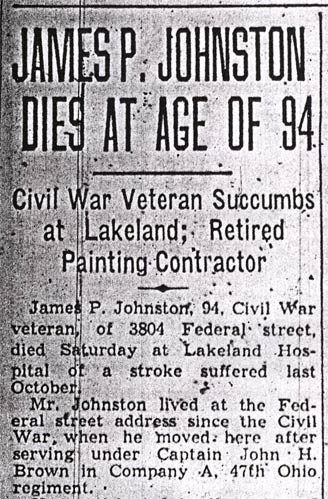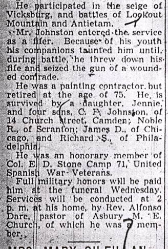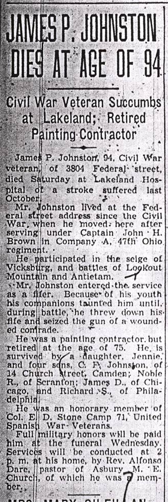 JAMES P. JOHNSTON was born in Ohio in 1844. He moved to Stockton, which became East Camden in 1899, shortly after the Civil War. He lived at 3652 Federal Street into the mid 1920s, when he moved to 3804 Federal Street. In the fall of 1937, after suffering a stroke, he was admitted to the Camden County hospital at Lakeland. James P. Johnston died there on March 19, 1938. James P. Johnston earned his living as a painting contractor for many years, retiring at the age of 1975. He was a long-time member of Asbury Methodist Episcopal Church on Westfield Avenue, and an honorary member of Colonel E.D. Stone Camp 71, United Spanish Civil War Veterans.