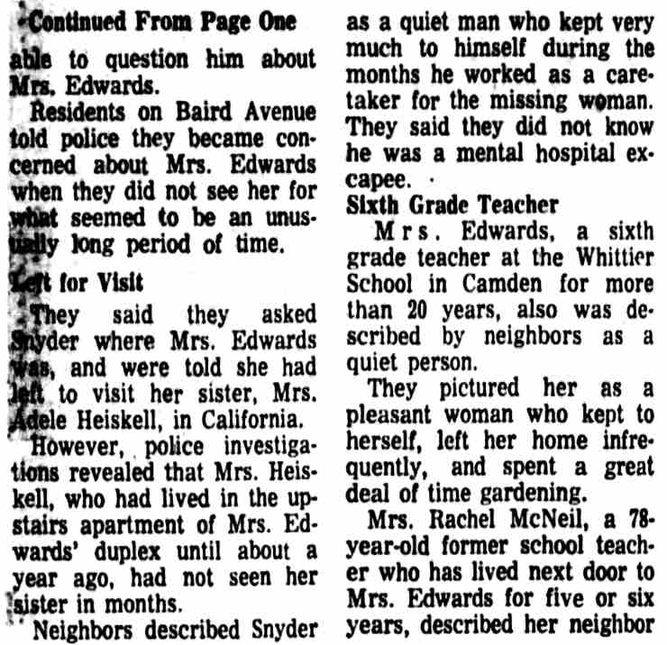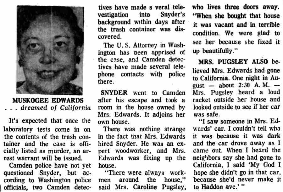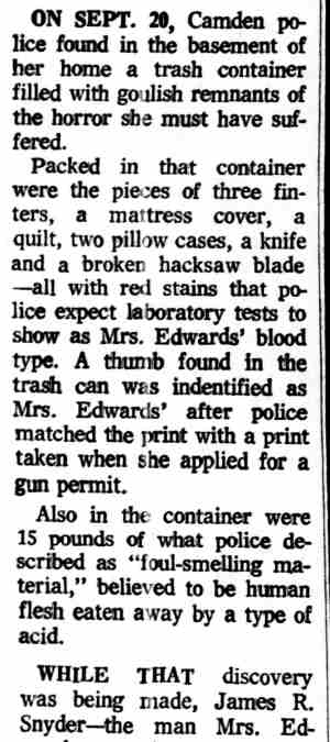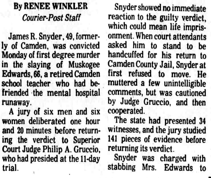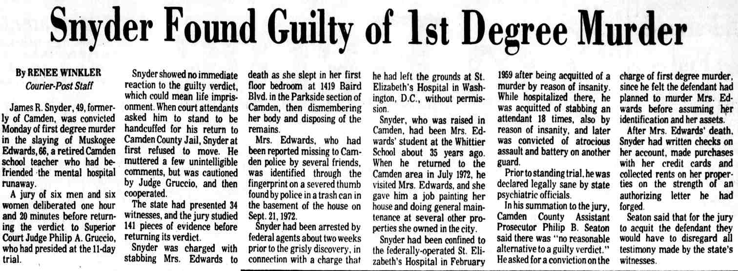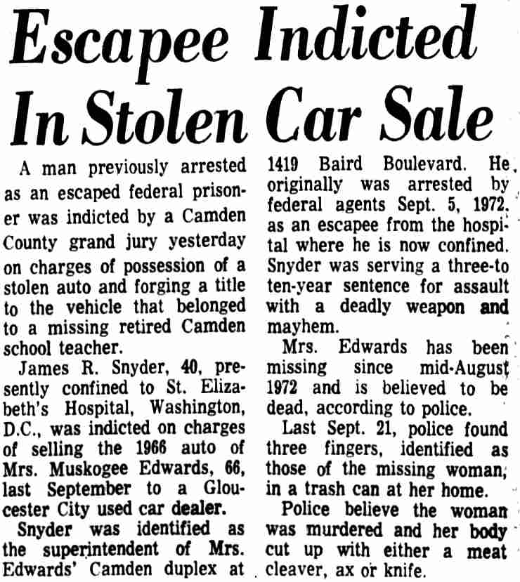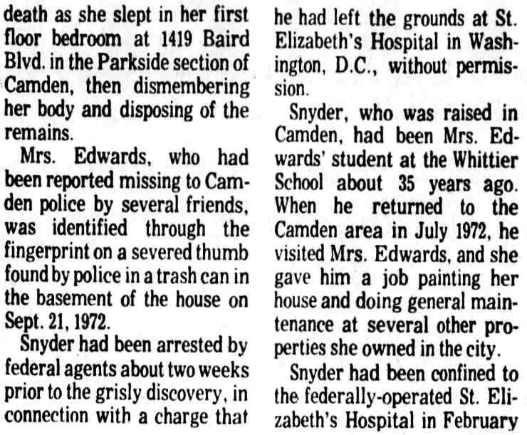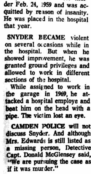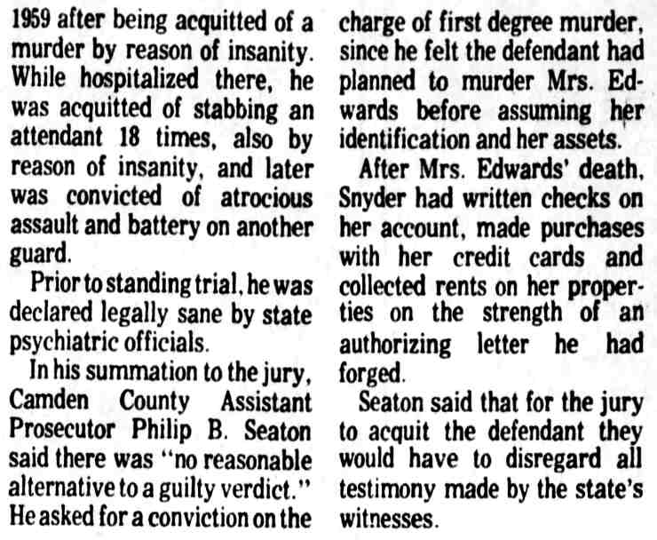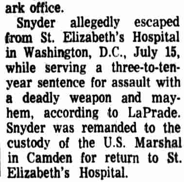 * 1 On October 15, 1956, Snyder was charged in Criminal No. 1063-56 in a three-count indictment in connection with his robbery and assault of a woman on September 5, 1966. (District Court File, Criminal No. 1063-56 (hereinafter File I)) 2 The district court committed Snyder to St. Elizabeth's on November 30, 1956 for a mental examination to determine whether he was competent to stand trial. (District Court File, Criminal No. 1079-56 at 7 (hereinafter File II). The Superintendent of St. Elizabeth's certified to the court in an April 4, 1957 letter that Snyder was mentally incompetent, and the district court committed him for further treatment. (File II at 8.) On October 24, 1957, the Superintendent advised the court that Snyder's mental competency had been restored and on October 31, 1957, the court found Snyder competent to stand trial. (File II at 9.) During the impaneling of the jury for the trial on the three-count indictment, Snyder suffered an epileptic seizure and the court ordered Snyder recommitted for further examination On May 21, 1957, the Superintendent advised the court that Snyder was again competent to stand trial and on June 3, 1958 the second trial on the three-count indictment commenced. 3 On June 27, 1958, Snyder was sentenced to consecutive terms of imprisonment totalling eight to twenty-four years 4 The government maintains that Snyder's commitment in that case remains in force today. Brief and Appendix for Appellee at 2 n.2 5 D.C.Code § 24-301(d) (Supp. VIII, 1960), as it existed at the time, provided: (d) If any person tried upon an indictment or information for an offense, or tried in the juvenile court of the District of Columbia for an offense, is acquitted solely on the ground that he was insane at the time of its commission, the court shall order such person to be confined in a hospital for the mentally ill. 6 We stated there: In a trash can they "found three fingers, the remains of three fingers, a large amount of human hair, approximately 15 pounds of musk, which was lime, cement and decomposed body tissue." Also in the trash can were two sheets, two pillow cases, and a quilt, all saturated with blood. One of the fingers was identified by a print as a finger of Muskogee Edwards. Also in the basement were a hack saw, a meat cleaver, a knife and an ax, all stained with blood. Human hair on the ax and on a hack saw blade found in the trash can matched hair found on a brush and in a bureau drawer belonging to Mrs. Edwards. Further investigation disclosed that Snyder moved in with Mrs. Edwards shortly after his escape from Saint Elizabeths and lived with her until she disappeared on August 16, 1972. The investigation, including handwriting analysis, developed also that after her disappearance Snyder sold Mrs. Edwards' car, forging her name to the title certificate, forged her name to a check, and signed her name to a letter authorizing one of her employees to pay to Snyder her share of certain rent money. Finally, handwriting analysis established that Snyder forged Mrs. Edwards' signature to a letter dated September 15, 1972 and addressed to Dr. Klinger and another doctor on the Saint Elizabeths staff. The writer purported to "tell the hospital officials of his (Snyder's) activities while here in Camden, New Jersey, for the past two months", spoke in complimentary terms of Snyder's ability and conduct and concluded that "(if) given a chance for a legal release, I would like to work further with him." The letter was postmarked in Washington, D. C. on September 20, 1972-the same day the police discovered the remains of Mrs. Edwards in Camden. 7 Snyder himself opposed the hospital's recommendation. (Tr. in Criminal No. 1079-56, IV at 44-45.) 8 Findings and Order in Brief and Appendix for Appellee at 31-42 9 The hospital's recommendation for unconditional release did not properly reply to the express standards that the statute provided as a basis for the court to make up its judgment. The hospital's November 19, 1980 recommendation stated: In September 1978, Saint Elizabeths Hospital recommended that Mr. Snyder be unconditionally released from Saint Elizabeths Hospital because he was diagnosed as No Mental Disorder and was, in our opinion, not a danger to himself or others within the reasonable future by reason of mental disorder. (Emphasis added.) R. 64. This statement does not fully comply with the statute. The statute is plain. Its principal provisions are (1) and (2). (See n.10, infra.) First, the superintendent is to certify: "That such person has recovered his sanity." This was not squarely complied with in 1980 by the statement that, "In September 1978 Saint Elizabeths Hospital recommended [his unconditional release] … because he was diagnosed as No Mental Disorder …" While this did not follow the precise terminology of the statute it probably constituted a substantial compliance. However, a certificate by the superintendent in the exact words of the statute would be preferred - but the 1978 statement is untimely in 1980. Second, the statute requires a statement: "(2) that in the opinion of the superintendent, such person will not in the reasonable future be dangerous to himself or others …" This also calls for a clear, plain certification by the superintendent with respect to Snyder's present dangerousness in 1980 - not for a reference to a diagnosis over two years old. The statement of "our opinion" presumably includes that of the superintendent and is unobjectional. But the limitation that he would not be a danger to himself or others "by reason of mental disorder" - does not comply with the statute. The statute calls for an unqualified statement of opinion, without limitation, that he "will not within the reasonable future be dangerous to himself or others …" The question of sanity is fully covered by (1). The inquiry called for by (2) is designed to give the judge a basis for evaluating the superintendent's reply to (1). Placing the quoted limita
