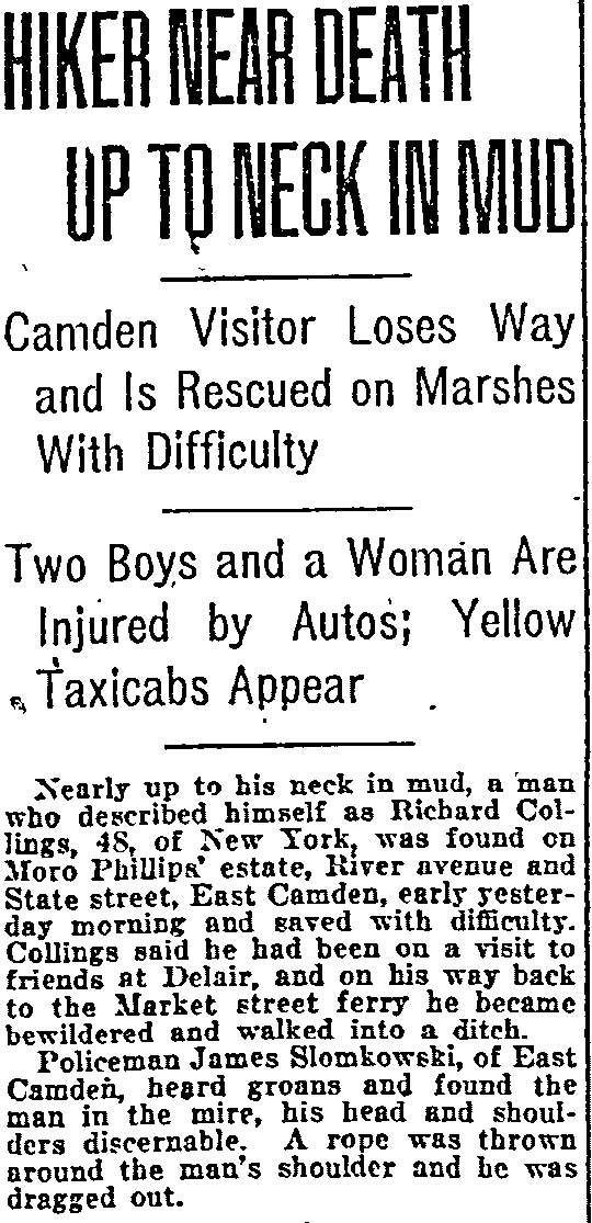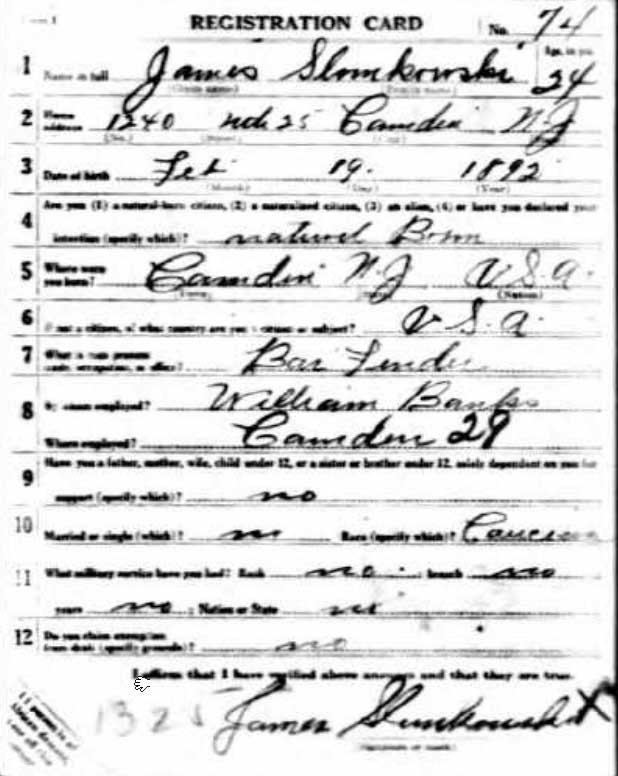 JAMES J. SLOMKOWSKI served for a short period of time as a member of the Camden Police Department in the 1920s. James Slomkowski was born in Stockton, win what is now the Cramer Hill section of Camden, New Jersey on February 19, 1892 to Theophile and Walery Slomkowski. His mother Theophile passed away around 1903. Walery is also recorded in Directories and Censuses as Walter and Warren. Prior to 1900 Street names in Stockton were fifferent than what they would be after the merger with Camden, and house numbers were not often given in the directories. It appears that the Slomkowski family was living on what is now North 25th Street as early as 1892. The 1900 and 1901 Directories give an address of 1242 North 25th Street. The 1902 City Directory indicates the family had moved to 1240 North 25th Street, where they maintained a presence until at least 1923. The 1910 Census shows James Slomkowski living with his widowed father, Warren Slomkowski, at 1240 North 25th Street in Cramer Hill. He was the fifth of the six children living at home, coming after Lizzie, Joseph, Albert, Anthony, and before Stephen. Warren Slomkowski them worked as a garden laborer, the four sons worked in factories, with James and Stephen working at one of the nearby woolen mills. When he registered for the draft, on June 5, 1917 James Slomkowski was living at 1240 North 25th Street in Cramer Hill. He was then working as a bartender for William E. Banks, who was then operating a saloon at 1251 North 27th Street. James Slomkowski served in the United States armed forces during World War I. He returned to his family in 1919 and was working as a boilermaker in a shipyard when the census was taken in January of 1920. Camden appointed a number of veterans to the police and fire department is the early 1920s, and James Slomkowski was one of these appointments. He had been appointed to the Police Department by the time the 1921 City Directory was compiled. In 1920 James Slomkowski married a widow, Katherine Banks, of 2922 Buren Avenue. She was the widow of Willim E. Banks, for whom James Slomkowski had worked for prior to going off to war. Katherine Banks was eighteen years his senior. They stayed at that address through 1928. James Slomkowski did not remain long with the police force. He had returned to work in the shipyards by the late 1920s. The 1930 Census shows James Slomkowski working as a shipyard laborer and living at 1044 North 24th Street with his wife and step-granddaughter Catherine Ulrich, aged 5. The 1940 Census shows James and Katherine Slomkowski at 1518 North 29th Street. Neither were working at the time the Census was taken. According to the Census he was disabled and unable to work. James J. Slomkowski passed away shortly after the 1940 Camden City Directory was compiled. He did not register for the draft in the spring of 1942, and the 1943 City Directory lists his wife, then living at 1520 North 29th Street, as a widow. |