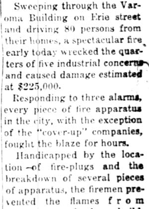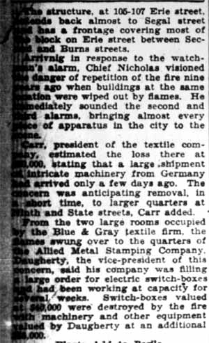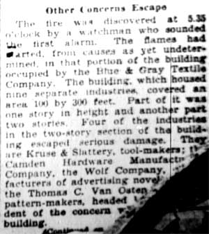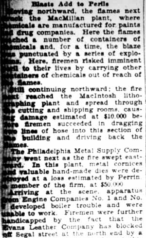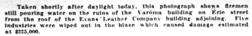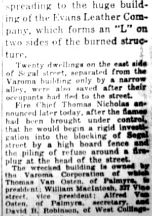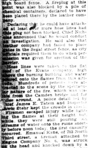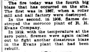 RESIDENTS FLEE AS FLAMES RAGE IN BIG BUILDING Factory of Evans Leather Co. Saved by Valiant Work of Firemen APPARATUS IS DISABLED; DEBRIS BURIED FIRE PLUG Metal Stamping Firm, Textile Concern Heavy Losers; Pattern Shop Saved |