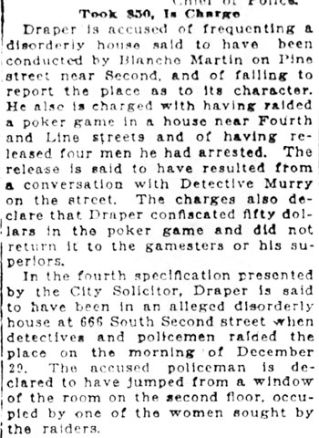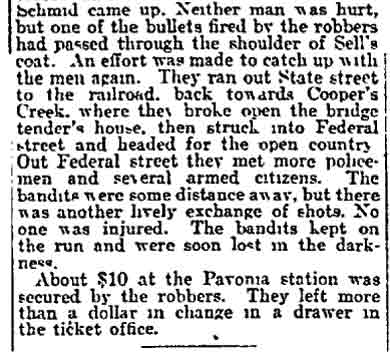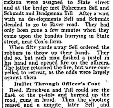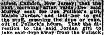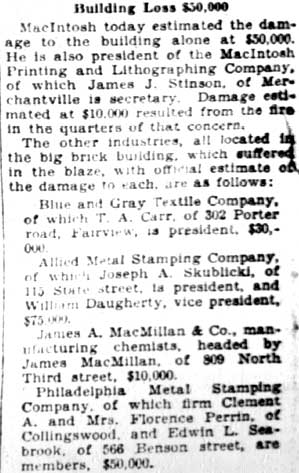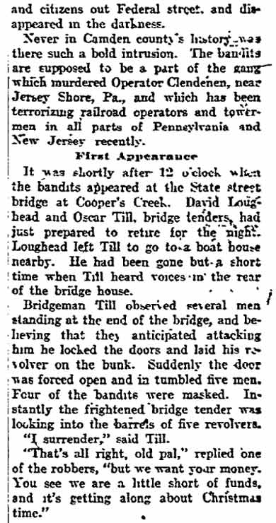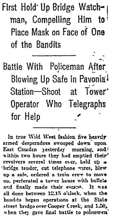 STORE Climbing to the roof of a shed in the rear of the Greenetz & Pellicoff jewelry store, 833 Broadway, burglars entered the shop early today and carried away $2,000 in loot. At noon today, Joseph Shapiro, 29 years old, 215 South Fifth Street, a clerk in the store, was being grilled by Detectives George Ward and Thomas Cheeseman, after being booked at police headquarters as having been arrested “on suspicion.” August 29 four suspected robbers were captured by police only a few minutes after they had smashed the plate glass window and snatched a tray of jewels at the same store. Policeman John McTaggart reported the burglary this morning. He is the brother of Policeman James McTaggart, who participated in the capture of the four suspects last August. Included in the loot of the burglars this morning were 35 watches left at the shop by their owners for repairs. At the shop it was said the owners of the watches would be reimbursed. Other articles stolen included 26 bracelets, 12 diamond bar pins, 15 pair of earrings, three fountain pen sets, and six strings of beads. At 7:30 this morning, Patrolman McTaggert noticed several men standing in front of the jewelry store. He learned that they had just discovered an open window and, investigating, found the shop had been robbed. The watches and other articles of jewelry were taken from trays and showcases. A safe in the store was left untouched. The building next to the jewelry store at 831 Broadway is unoccupied and it was through this structure that the burglars entered. They climbed to the roof of a shed at the rear, entered a second story window and followed a corridor to an inner door of the jewelry store, forced open the door, and entered. The capture of the four men at the store more than four months ago resulted in commendation from Chief James E. Tatem for the three officers who participated. With Policeman Edward Smith and Frank Truax, Patrolman James McTaggert took the four men at revolver’s point. The men arrested at that time, still awaiting trial, are James Toner, 54 years old, 1204 Vine Street, Philadelphia; Mervin Campbell, 24 years old, 2309 Carlisle Street; James J. Kelly, 25 years old, 2121 Brandywine Street; and Frank MacCrossan, 33 years old, of 1328 Pearl Street. The proprietors of the store are Joseph and Michael Greenetz, 1468 Haddon Avenue, and Abraham Pellicoff, 1417 Haddon Avenue. |