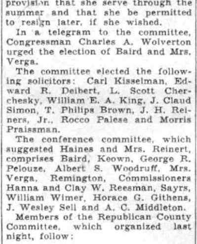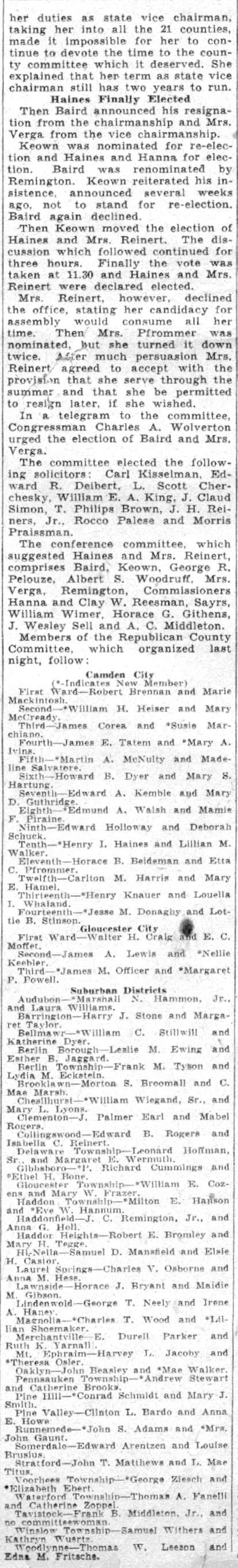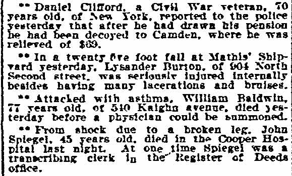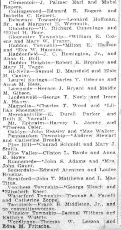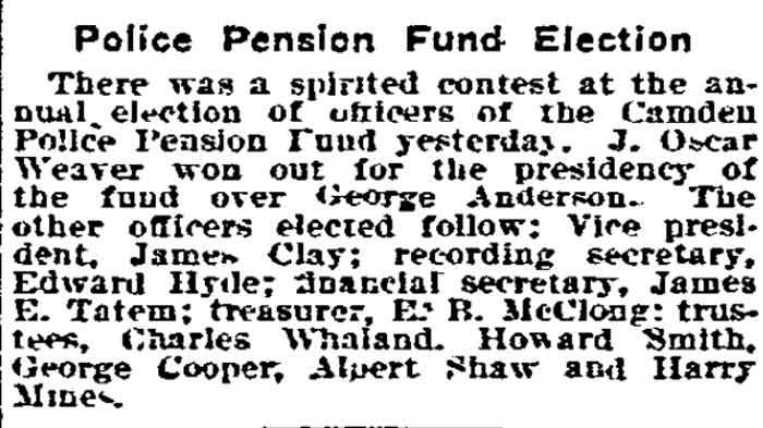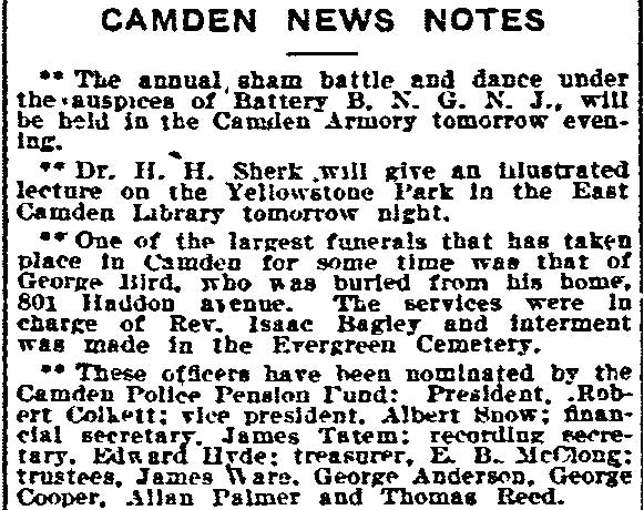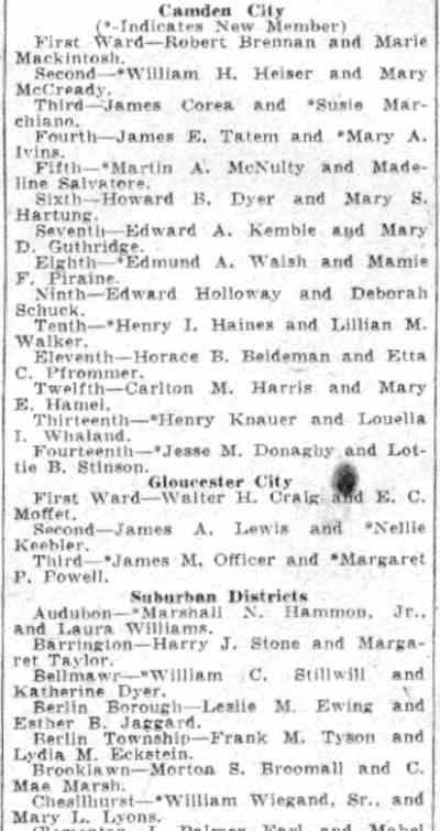 Ward louis street - Florence Street decatur street - Mt. Ephraim Avenue William G. Ritter - Peter English Walter Wilkie - Ralph Bakley Joseph Ward Sr. - E. Frank Pine Clifford Del Rossi - Theodore Guthrie Melvin Cain - William F. McGrath sylvester "wes" McGrath, City Detective urquhart ward - Robert Ward John Smith - Maurice Mensch Victor King - Michael Mathews james e. tatem - Arthur Colsey |