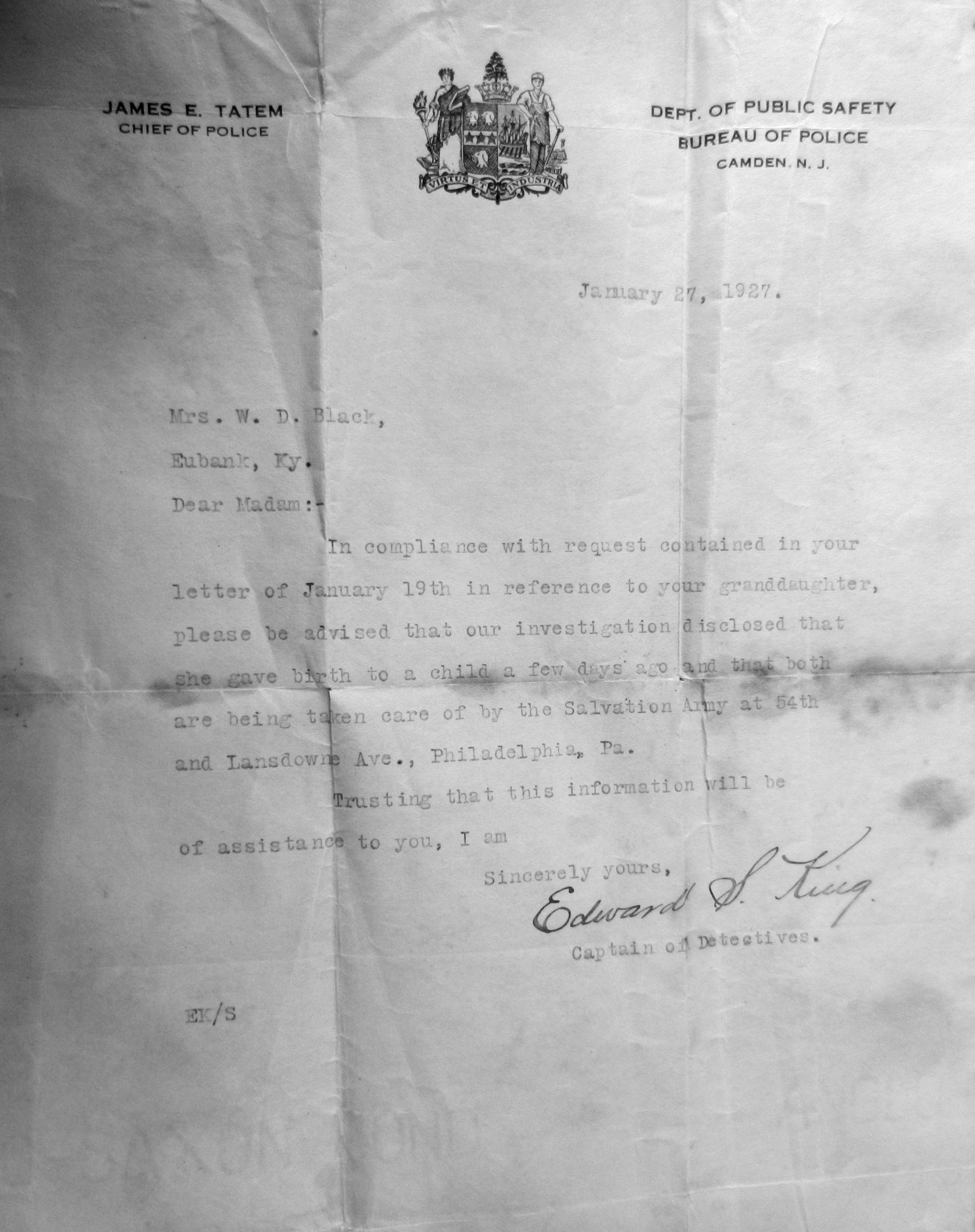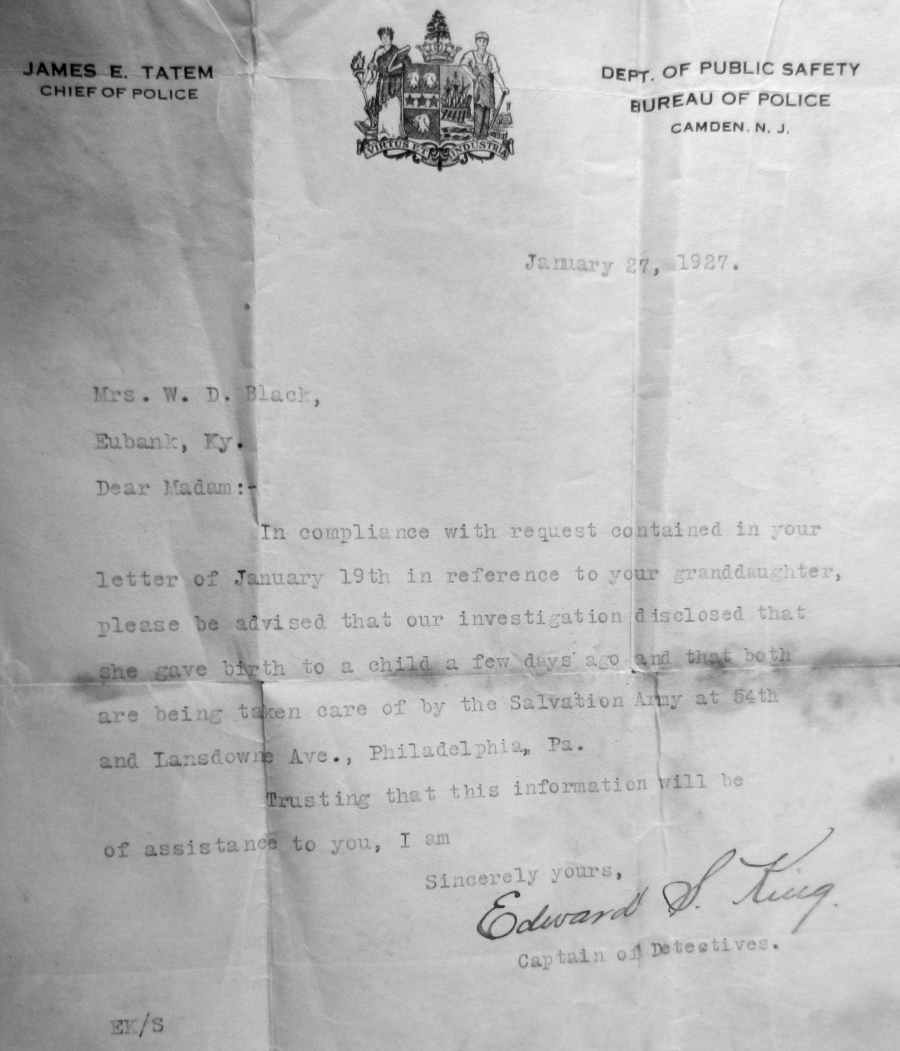 written to Mrs. W.D. Black of Eubank, Kentucky by Captain of Detectives Edward S. King January 17, 1927 |