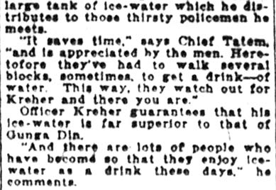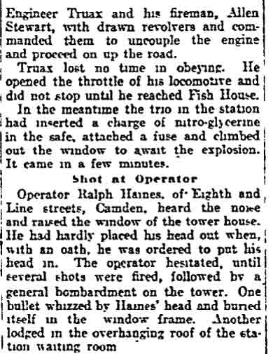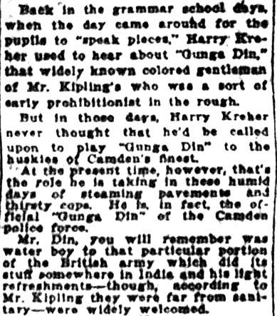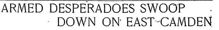 NICE SHOOTING PARTY Wanted: Targets for Camden’s new desperado eliminators. Bandits, burglars, snipers and their ilk are requested by Chief of Police James E. Tatem to apply at police headquarters Monday morning at 10 o’clock, when a practice shooting party will be held. Chief Tatem said today Camden’s bandit-chasing squad is “just rarin’ to go” with six new automatic rifles guaranteed to shoot full of holes the toughest bandit in less time than it takes to say “Aligoop.” For the further enlightenment of the bandit fraternity, Chief Tatem announced detailed instructions on how to use the new carbines will be given this afternoon at 3 o’clock to bandit chasing police by Captain Arthur Colsey and Herman Engle, a representative of Stein Brothers, this city. The rifles arrived at police headquarters yesterday afternoon. They will be distributed in each of the city’s three police districts in the campaign to rid the city of desperadoes. The weapons can fire a magazine of 20 shots in a few seconds. They will be mounted in the three red bandit chasing coupes used by the district squad members. One of the coupes is now being used by Archie Reiss and Vernon Jones in South Camden, while two others are expected to be delivered within a few days, according to Chief of Police James E. Tatem. They will be assigned to Walter Smith and Joseph Carpani, First district detectives and Louis Schlam and Richard Donnelly in the East Camden district. Swivel attachments make it possible to fire the guns from a fixed point in an automobile. Detached they may be fired from the shoulder. Besides firing a magazine of 20 shots without stopping, they can be adjusted to single fire, using .45 caliber cartridges. Instruction in the adjustment and use of the weapons will be given today by a representative of the company that sold them- at $175 each— to the city . |