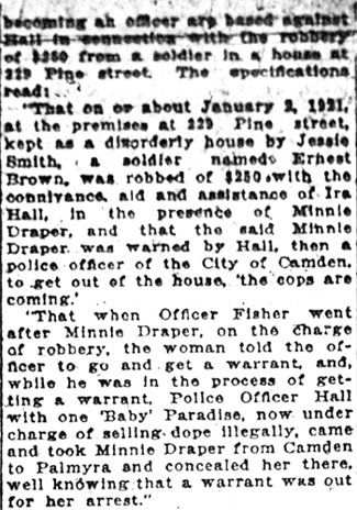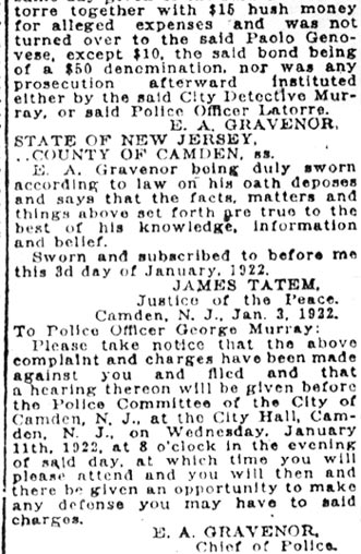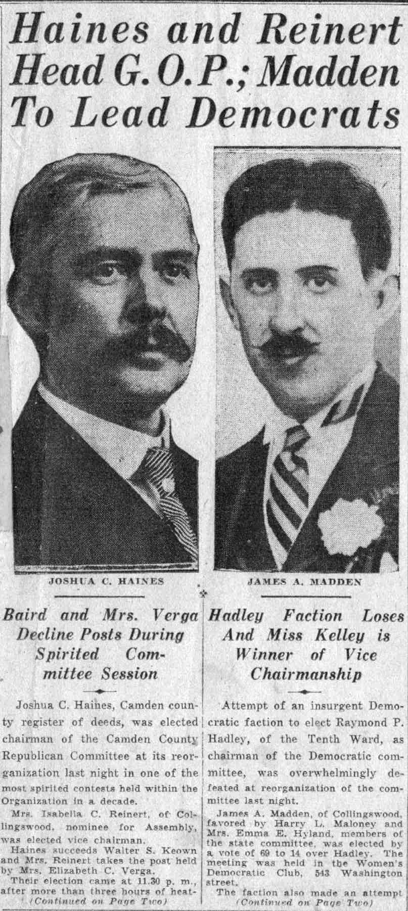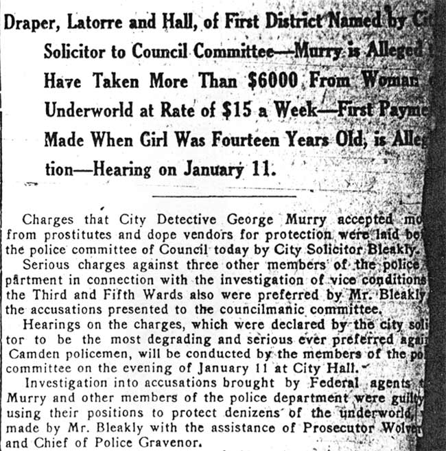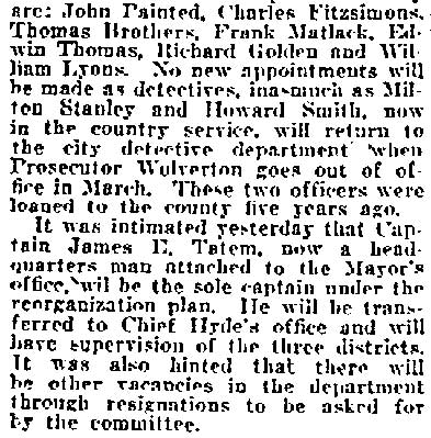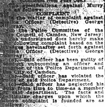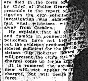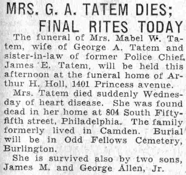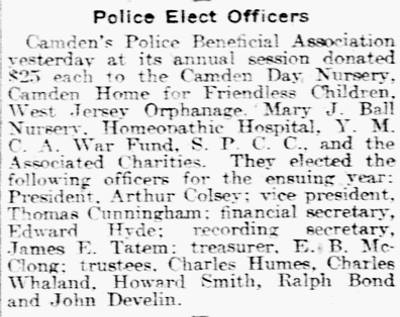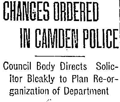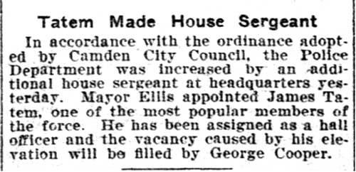 JAMES E. TATEM was born in Camden in May of 1876 to William A. and Anna Emley Tatem. There were at least two older siblings, a sister, Mary, and a brother, Edward, and two younger brothers, George and William H. Tatem. In 1880 the Tatem family lived at 101 North 7th Street. William Tatem was then a produce dealer. Sadly, he had passed away by 1887. The family was then living at 422 Henry Street in South Camden. The 1890-1891 Directory shows the Tatems at 619 South 5th Street, where older brother Edward Tatem also conducted a milk business. At the age of 24 James Tatem had married Ella Lummis. The couple resided with her parents, at 435 Beckett Street at the time of the 1900 Census. He had by this time already joined Camden's police force. James Tatem joined Camden's police department in 1899, an appointee of Mayor Cooper B. Hatch. He managed to avoid being discharged when Democrat mayor Joseph Nowrey was elected. When the Republicans returned to City Hall in 1905, new Mayor Charles Ellis saw "Smilin' Jimmy's" ability to calm a troubled situation, and by 1910 he was promoted to sergeant and by 1920 to captain. For much of Ellis' term James Tatem served as an an aide to the Mayor. He also served as a Justice of the Peace in the early 1920s. James Tatem remained on with the Camden police department when Mayor Ellis retired to become Postmaster in 1922. The following year Victor King was elected mayor. King also took a liking to the ever-diplomatic Tatem, and saw that he was appointed Captain of the newly created traffic bureau. When Commissioner Frank Hitchner, then the director of public safety, fired Chief Edward S. Hyde, Tatem was chosen to be the new Chief. James Tatem faced a daunting challenge in his new post, one that in retrospect he may not have been prepared for- not that many police officers of his generation were. Commissioner. He was an officer who came up in the 1890s and 1900s faced with the new organized crime model that took hold in America when Prohibition was instituted in 1919. That and his dalliance with the Democratic Mayor King foretold Chief Tatem's replacement. After a shooting in a downtown bar, the Bluebird Cafe, in late 1927, Commissioner David S. Rhone, the new director of public safety, took a more active role in the affairs of the department. Finally, on March 2, 1928 Mayor Winfield S. Price replaced Chief Tatem, appointing Captain Lewis H. Stehr Jr. as acting Chief of Police. This was a surprise to many, who had assumed that the popular Chief Charles T. Humes would get the post. James Tatem then retired on a full pension. It is worth noting, however, that his service to the city was recognized in that he had been granted a raise on March 1, 1928 which had the effect of locking in his pension at a higher amount. The marriage between of James and Ella Tatem appears to have been a stormy one. By 1910 the couple had separated, and he appears to never have remarried. He then lived with his mother, grandmother Elizabeth Emley, widowed sister Mary Gahan, and nephew Edward at 535 South 5th Street. James Tatem would remain at this address into the 1920s. Hr moved to 615 South 5th Street by 1924. James Tatem was still living there with his sister as late as April of 1930. The Census shows them living at 615 South 5th Street, next door to Camden firefighter Leonard Megee, and on the same block where he had resided as a boy. James Tatem's younger brother, William Howell Tatem, served as a member of the Camden Fire Department from the late 1900s into the 1930s. |