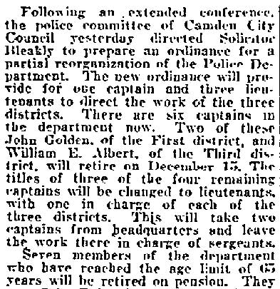 This story erred in reporting, as retirement at age 65 was NOT mandatory at the time. William E. Albert, Richard Golden, Frank Matlack, and Edwin Thomas did retire. john golden, john painter, Charles Fitzsimmons, Thomas Brothers, and William Lyons continued to work in the Police Department. john golden was eventually promoted to Chief of Police. |