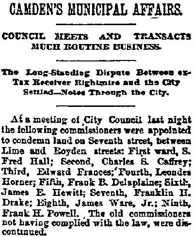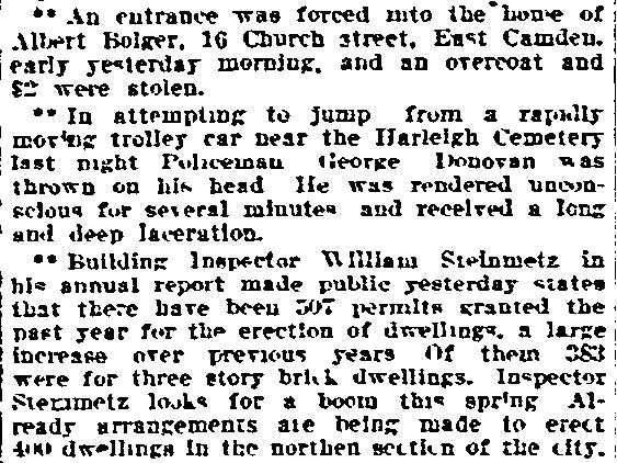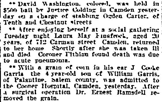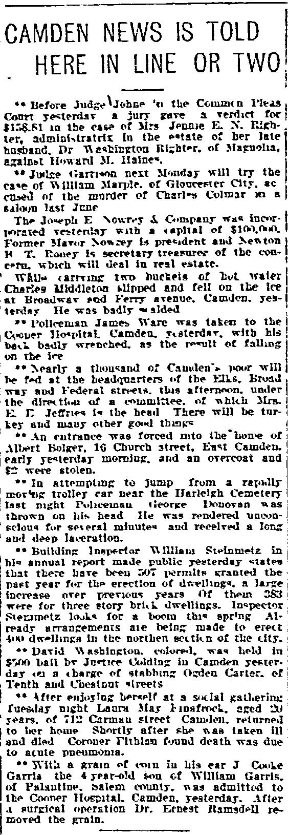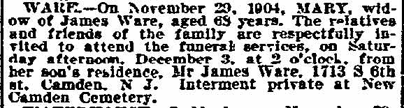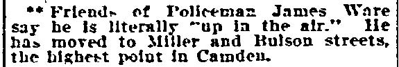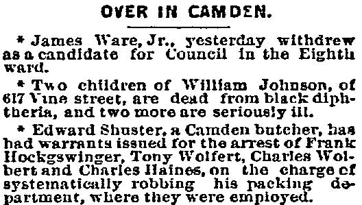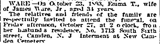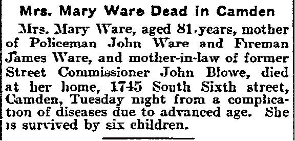 JAMES WARE JR. was born in Philadelphia, Pennsylvania in August of 1854 to James and Mary Ware. He was the oldest of at least five children, coming before brothers John, William, and George, and a sister, Isabella. The family came to Camden after the Civil War. James Ware Sr. worked as a "ship's joiner", that is to say, as a ship's carpenter. The 1878 City Directory James Ware Jr. lived on Ferry Avenue near Bem Street (since renamed South 7th Street). James Ware Jr. was then a laborer, but was destined for better things. His parents, brother John Ware, and the younger siblings were living on Kossuth street south of Ferry Avenue. When the Census was taken in 1880 James and Emma Ware and children Rebecca and Joseph A. Ware were living in Camden's Seventh Ward. His parents and siblings were all still residing on Kossuth Street. James Ware soon returned to the Eighth Ward and became active in politics as a Republican. The 1887 Directory shows James Ware living at 1713 South 6th Street. By 1890 his political activities had paid off, as he had been appointed Superintendent of Camden Cemetery. In 1888 James Ware Jr. was elected to the Board of Education from the Eighth Ward. A measure of his influence in local politics is shown by the fact that is brother John Ware was appointed to the Fire Department in 1890, and his father a job with the Water Department in 1891. James Ware Jr. was considering a run for City Council but withdrew from the race in March of 1892. This may have had something to do with the health of his wife, Emma. Sadly, Emma T. Ware died in October of 1893, leaving her husband to care for their four children- Joseph, aged 15, Rebecca, aged 14, Jesse, aged 9, and two year-old Emma. James Ware remarried in 1895. His new wife, Harriet, was a young widow about 20 years his junior, with a son. The marriage produced two daughters after 1900, Evelyn and Marie. The couple remained together until James Ware's passing in the early 1920s. In January of 1898 James Ware was appointed to the Camden Police Department. He served until 1914 when he filed his retirement papers, after having been injured while making as arrest. Tragedy again struck that year when his eldest son, Fireman Joseph A. Ware, was died in July after being injured in the line of duty the previous month. James Ware Jr. was still living in the Eighth Ward when the census was taken in January of 1920. By the time the 1924 Camden City Directory was compiled he had passed away. |