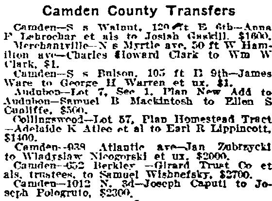 Corson - I.C. Beatty - Edward Gillingham - W.H. Husted - Homer Snyder Edward A. Martin - Joseph M. Engard - Frederick A. Rex - C.V.D. Joline - Frank Lee Dickinson Martin Bergen - A.J. Greene - C.S. Magrath - Adam P. Sloan - Robert . McDougall Alexander Schlessinger - J. Wesley Sell - James Ware Jr - Water Stret - Vine Street - Federal Street |