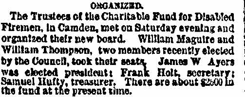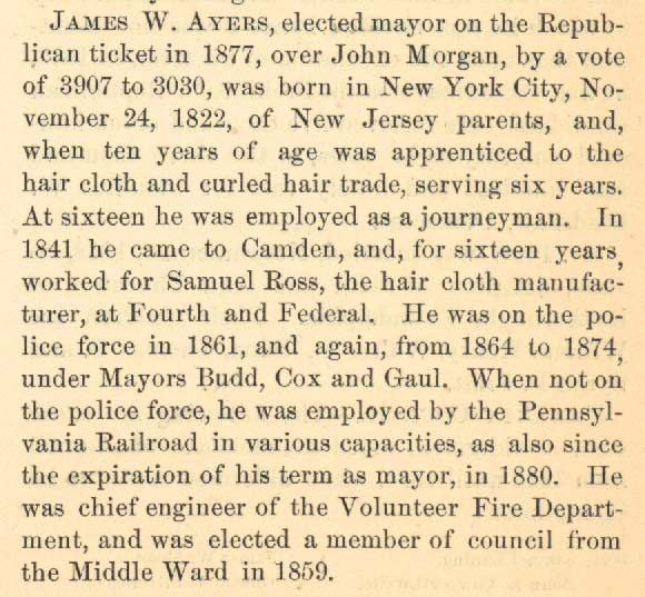 JAMES W. AYERS was born in New York City on November 24, 1822. He was apprenticed at the age of 10 in the hair cloth and curled hair trade. He became a journeyman in the trade at the age of 18, and in 1841 he moved to Camden, where he found work with Samuel Ross, at Ross's Haircloth Factory at Fourth and Federal Streets. He remained with the firm after the 1849 fire in which the plant burned down. A Republican, James W. Ayers was elected to City Council from the Middle Ward in 1859. He was a member of the Camden Police Department in 1861, and again from 1864 to 1874, under Mayors Paul C. Budd, charles cox, and Samuel M. Gaul. While not on the force, he worked for the Pennsylvania Railroad in a variety of positions, and was a volunteer fireman. In 1866 he was named Chief Engineer of the Volunteer Fire Department. On June 7, 1866 Camden's City Council enacted an ordinance reorganizing the volunteer fire service to improve efficiency in operations. This ordinance provided for increased compensation to the fire companies (Weccacoe and Independence got $800 per annum to be paid quarterly, the Weccacoe and Shiffler Hose companies and the United States Fire Company received $200 annually). The volunteer fire companies were also directed to select a Chief Fire Marshal and three Assistant Marshals, one from each district. The selections were subject to approval by Council. The new department was called "The Fire Department of the City of Camden". In protest of this ordinance the New Jersey Fire Company No.4 withdrew from the new, organized volunteer department. James W. Ayers of the Weccacoe Engine Company No. 2 was elected Chief Marshal and served until 1868 when he was succeeded by Wesley P. Murray of the Weccacoe Hose Company No.2. Murray was aided by Assistant Engineers William Abels, First District; Simeon H. Long, Second District; and Charles H. Knox, Third District. Both Ayers and Murray were well organized and popular with the volunteers. For this reason the New Jersey Fire Company No.4 petitioned City Council to be readmitted to the volunteer department. Although the petition was supported by all the fire companies, it was rejected by the Council which had already sold the New Jersey apparatus on June 13, 1866 for $100. Late in 1867 three major fires occurred in the city. The first, on the afternoon of Wednesday, November 20 about 3 P.M. destroyed the Third Street Methodist Episcopal Church located above Bridge Avenue. This disastrous blaze was one of the largest fires in the history of the City destroying five dwellings and seriously damaging several others while leaving the church in ruins. A roof fire was discovered on the south side of the church; the cause believed to be a defective flue but some said it was a spark from a passing locomotive. A stiff southwest breeze quickly spread the flames, overwhelming all efforts by the firemen. Chief Ayers summoned assistance from several Philadelphia volunteer companies as Camden's fire fighters turned their efforts toward saving exposures. These efforts were greatly hampered by an inadequate water supply. The dwellings at 229, 231 and 233 Taylor Avenue burned to the ground while 227 sustained heavy damage to the roof and top floor. Properties at #9 and #11 South Third Street also were damaged as flying embers ignited their roofs. A dwelling at #13 South Third Street was heavily damaged by the flames. Only due to the valiant efforts of the combined fire forces was the conflagration halted late that night. Both Chief Ayers and Captain Wesley P. Murray were commended for their judgment and action while directing firefighting efforts. Citizens felt that if the water supply had been better the: efforts of the firemen would have contained the blaze much earlier. Nearly a month later the second blaze occurred; the Nickel Works, owned by Wharton and Fleightman and located in the block bounded by York, State Tenth Streets and Cooper's Creek. The fire started about 6 P.M. on Sunday: the 15th, when the dryers in the drying house overheated. A total effort by the Independence and Weccacoe steam engines, the United States ladder company and the hose companies of the department contained the fire to the original 40 by 50 foot building. A good water supply from the creek nearby and a quick response by fire companies contained the spread of fire resulting in only minor damage to several surrounding buildings. Eight days later, on December 23, 1867 the Camden Rolling Mills Company was severely damaged by fire. The mill was one of the city's largest industries and stood at the head of Third Street on the Delaware River. The blaze began in the machine shop when a cinder was thrown from one of the puddling furnaces. Flames spread rapidly through the wood frame building that covered almost an acre of ground. A prompt response and assistance from Philadelphia enabled fire fighters to save the other buildings in the complex. 94 The Good Intent Steam Fire Engine Company and the William Penn Hose Company were the first Philadelphia companies to arrive on the scene to aid the Camden fire fighters. Steamers from the Mechanic, Philadelphia and Fame Fire Companies subsequently arrived and were followed by additional hose and hook & ladder companies. Good Intent's steamer had to pass through a section of the burning building to reach a wharf from which to supply much needed water to combat the blaze. While doing so, it became jammed between a pair of shears. Fire fighters were successful in freeing the apparatus but not before the horses were badly singed. Lost in the fire were seven puddling furnaces, four heating furnaces, one scrap furnace, twenty-two boilers, six steam powered drive engines, thirty--two nail machines, three trains of bar rollers and other machinery and stock. After the Nickel Works fire in 1867 another, more destructive blaze occurred at the complex on Sunday night, July 12, 1868. Flames were discovered in the southwest corner of the main building an