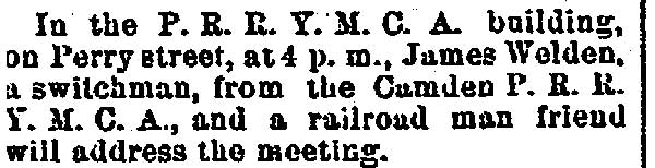 The 1885 Camden City Directory shows James Welden working as a fireman and living at 10 Pearl Street. By 1895 James Welden had gone to work for the Pennsylvania Railroad. The 1895-1896 City Directory shows him living at 726 Clinton Street and working as an engineer. He laso worked as a switchman and as a brakeman for the Pennsylvania Railroad during the 1890s. The 1899 City Directory shows him living at 216 Berkley Street. By the time the census was taken in 1900, the Welden family had moved to 423 Berkley Street. James Welden is listed at 615 Clinton Street in the 1906 Directory, and at 210 South 5th Street in the 1910 Census. By that time he had been promoted to conductor. James and Catherine Welden are listed in the 1918-1919 City Directory and in the 1920 Census at 404 Haddon Avenue. The 1924 Edition shows that they wee living with sons Edwin and Charles S.W. Welden at 423 Haddon Avenue. James Welden passed away in 1926 and was buried at Harleigh Cemetery. His widow was then living at 1354 Park Boulevard. She later moved to Collingswood. Catherine Welden joined her husband on December 26, 1936. |