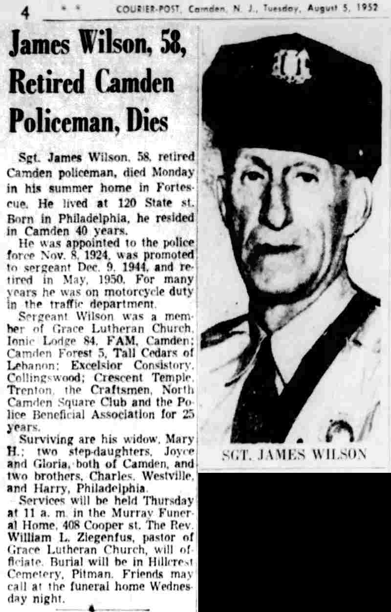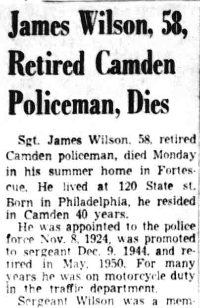 JAMES WILSON was was born in Philadelphia, Pennsylvania on March 20, 1891. The 1920 Census shows him living at 823 Morgan Street in Camden with his wife and daughters Josephine and Margaret. He was the working as a foreman at a shipyard, most likely the nearby New York Shipbuilding Corporation yard. James Wilson was appointed to the Camden Police department on September 9, 1924. The 1930 Census shows James Wilson living at 697 Fairvew Street with his wife, the former Josephine Meyers, son James M. Wilson Jr., and daughters Josephine, Margaret, and Theresa "Tess" Wilson. His wife passed away on January 2, 1940 of a heart ailment. The Census shows James Wilson living with his son and daughter Theresa at 754 Sylvan Street. When he registered for the draft in April of 1942, James Wilson was living at 224 Cooper Street. |