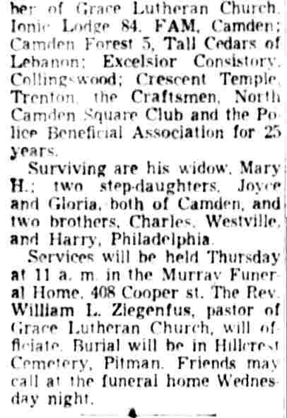 Services took place at the home, 832 Haddon Avenue, and burial was in Harleigh Cemetery. Members of the police detail were Sergeant jefferson kay, patrolmen Thomas Kauffman, William Moll, John Stanton, Thomas Welch and James Wilson.