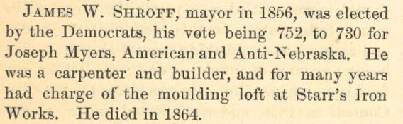 JAMES W. SHROFF was a carpenter and builder who resided in Camden's North Ward. He was active with the Independent Order of Odd Fellows. James W. Shroff was elected mayor in a close election in 1856 as a Democrat, carrying the city by a margin of only 22 votes. He did not run for re-election. James Shroff subsequently worked at the iron works conducted by John Farson Starr and Jesse W. Starr, where he had charge of the moulding loft. He was killed on September 3, 1869 when he fell from a scaffold, as reported in the September 6, 1869 edition of the Philadelphia Inquirer. |