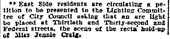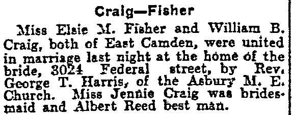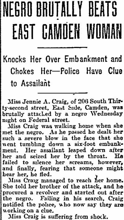 JENNIE A. CRAIG was born in New Jersey around 1877 to Thomas B. and Margaret Craig. The family, which included older brother William, was living in the village of Greenwich, in Cumberland County, when the Census was taken in 1880. Thomas Craig worked as a baggageman on the railroad. When the census ws taken in June of 1900 the family was living on Main Street in Pemberton, New Jersey. Not long afterwards, they moved to Camden. The Craig family was living at 206 South 32nd Street in East Camden in January of 1904 when, on January 8th, Jennie Craig was attacked while walking home along Federal Street between South 30th and South 32nd Street. In June of 1904 Jennie Craig served as maid-of-honor when her brother William took Elsie Fisher of 3024 Federal Street as his wife. The Craigs were still living at 206 South 32nd Street when the 1906 City Directory was compiled. Thomas Craig had by then passed away. When the Census was taken in 1910, Jennie Craig had not yet wed. She was living with her brother William, sister-in-law Elsie and mother Margaret at 33 North 34th Street in East Camden. Jennie Craig was then working as a saleslady in a jewelry store. The family was still there when the 1914 City Directory was compiled. Jennie Craig, still un-wed, was working as a cashier. William and Elsie Craig had moved to Collingswood by the time the 1918-1919 Camden City Directory was being compiled. Jennie Craig does not appear in the 1920 Census or the 1930 Census. |