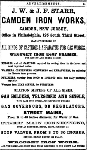 JESSE W. STARR was born in Philadelphia of Quaker parents around 1809. He went to work for his father, Moses Starr, and by the mid 1830s the two were partners in a steam boiler business. His younger brother John F. Starr would join them as an apprentice in 1834, becoming a partner in 1840. In the early 1840s the Starrs were built three iron steam boats, the Conestoga, the Independence, and the Ida. The Starr brothers had come to Camden by 1845. That year, John F. Starr who had previously leased the iron foundry of Elias Kaighn at the foot of Stevens Street, built the Camden Iron Works on Bridge Avenue. for, as Prowell wrote in 1885, "the manufacture of gas machinery, street mains, and other castings." The foundry was named the Camden Iron Works, and would remain a presence in Camden past 1900. Jesse Starr became a partner in the business in 1846, and as J.W. & J.F. Starr, and another facility was built on Bridge avenue below Second Street. This was a three story building, originally used as a hardware store, and known for many years as Starr's Hall. The Starr brothers' business grew to the point that the brothers purchased from the estate of Richard M. Cooper land north of Line Street along Cooper's Creek to build a new and enlarged foundry. This complex was completed in 1849. The Camden Iron Works Company was incorporated March 21, 1866 with a capital of $300,000. The Starr brothers controlled practically all the stock. The Camden Iron Works became the largest such business in North America, furnishing the gas machinery and building the gas works for most of the large cities in the United States and Canada. During the late 1850s and early 1860s former Camden mayor James W. Shroff worked for the Starr brothers. John F. Starr was elected to Congress in 1862 and served through 1866. During this period he also was named a director of the Farmer's and Mechanics Bank of Camden, which soon was renamed the First National Bank of Camden. Banking would soon require all of his attention, and on December 1, 1868 the firm of J.W. & J.F. Starr was succeeded by Jesse W. Starr & Sons, the firm including Jesse W. Starr, his son Benjamin A. Starr, and brother-in-law Benjamin F. Archer. Jesse W. Starr had married in the 1830s, and his wife Sarah Ann bore their first child, Benjamin A. Starr, in 1836. Daughters Catherine and Sarah came, the latter born in 1843; after which the family came to Camden NJ. Four more children would be born before Sarah Ann passed away in the mid-1850s. The children, born in Camden, were Jesse W. Jr., in 1846; Mary Ann, 1848; Elizabeth, 1851; and Rebecca, born in 1854. Jesse W. Starr Sr. was again married, in Camden on January 14, 1858, to Emeline Archer, older sister of Benjamin F. Archer. In 1870 Jesse W. Starr & Sons purchased the foundry of the bankrupt Camden Rolling Mills Company, at the head of Third Street. The rolling mill, used for the manufacture of bar iron, had been one of the larger industries in Camden prior to an 1867 fire and the death of founder J.W. Middleton. The Jesse W. Starr & Sons Co. Inc., later sold the rolling mill and its attached property to businessmen from Philadelphia. In 1871 Jesse W. Starr contacted the committee of City Council appointed to select a site for a new City Hall in order to donate four and one half acres of land along Haddon Avenue south of Mickle Street for that purpose. Among the conditions attached to the donation were the following: 1. That the erection of a City Hall should begin thereon within three years and completed within five years; 2. That the ground should always be used for a City Hall and public park and if it should cease to be so used it was to revert to him or his heirs. As this site was outside of the what was then the developed part of Camden, there was great controversy as to weather to build a new City Hall at this location. The issue was not settled until 1874. On July 2, 1874, Mr. Starr also gave the city the ground upon which the Soldier's Monument now stands. Camden's City Hall was built by Enoch Allen Ward, and completed in 1875. This building would serve as Camden's seat of government until the present building's dedication in 1931. On December 20, 1883, the City of Camden wishing to own the Haddon Avenue site free of all conditions paid Jesse W. Starr $10, 813.19 for an absolute conveyance . T he Camden Insurance Safe Deposit & Trust Company was chartered by an act of the Legislature, approved April 4, 1873, and the subscription book was opened May 31, 1873, at Parson's Hotel, Front and Federal Streets, which was owned and operated by Stephen Parsons. Jesse W. Starr was the first president, followed in succession by James B. Dayton, Peter L. Voorhees, William C. Dayton, Alexander C. Wood, Edward L. Farr, and Ephraim Tomlinson. In 1938 the bank shortened its name again to that of Camden Trust. By the time it celebrated its 75th Anniversary, in 1948, it was the largest bank in South Jersey, and seventh largest in the state. Very involved in the civic life of Camden, Jesse W. Starr was, in April of 1865, one of the founders of The Camden Home For Friendless Children, which was located for over 90 years at Haddon Avenue, above Mount Vernon. During the 1850s Jesse W. Starr gave the Catholics of Camden the use of Starr's Hall, until they could build their first church on the southeast corner of Fifth and Taylor Avenue, in 1859. Starr's Hall stood on Bridge Avenue, below Second Street, and was demolished to make room for the Pennsylvania Railroad yard. The Starr brothers built homes near the foundry, John F. Starr making his home at 1115 Line Street, and Jesse W. Starr Sr. residing on Newton Avenue at the time of the 1880 census. John F. Starr moved to 521 Linden Street, one of the then new Linden Terrace homes, in the mid 1880s. Jesse W. Starr met with some financial difficulties in his later years. In 1883 the control of the Camden Iron Works was secured by R.D. Wood & Company who conducted the business until