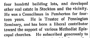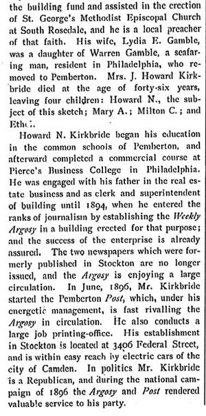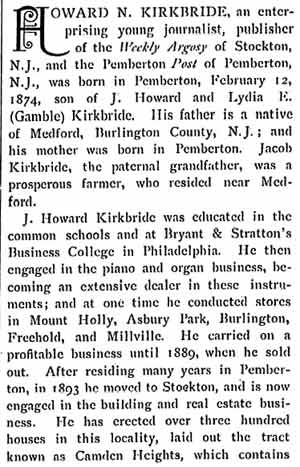 J. HOWARD KIRKBRIDE was born on March 3, 1849 in Medford NJ. He married Lydia E. Gamble in 1873, and lived in Pemberton NJ for many years. In 1886 he ran for Burlington County Surrogate on a Prohibition ticket. J. Howard Kirkbride came to what is now East Camden in 1893 where he and became involved in the building and real estate business. By 1897 he had erected 300 homes in what was then Stockton Township (present-day East Camden), and laid out 400 building lots in the tract known as Camden Heights. Previously active as a member of the First Methodist Episcopal Church, in 1893 he too part in founding St. George's Methodist Episcopal Church, which stood at 3316 Mickle Street in what is now East Camden. J. Howard Kirkbride passed away on July 5, 1910. His son, HOWARD H. KIRKBRIDE was born in Pemberton NJ on February 12, 1874. He moved to Camden with his father, and initially worked with him in the real estate and construction business. In 1894 he entered the newspaper business, and soon owned a printing business at 3406 Federal Street. He was the publisher of the Stockton Argosy, a weekly newspaper which was popular in Stockton Township in the late 1890s. |