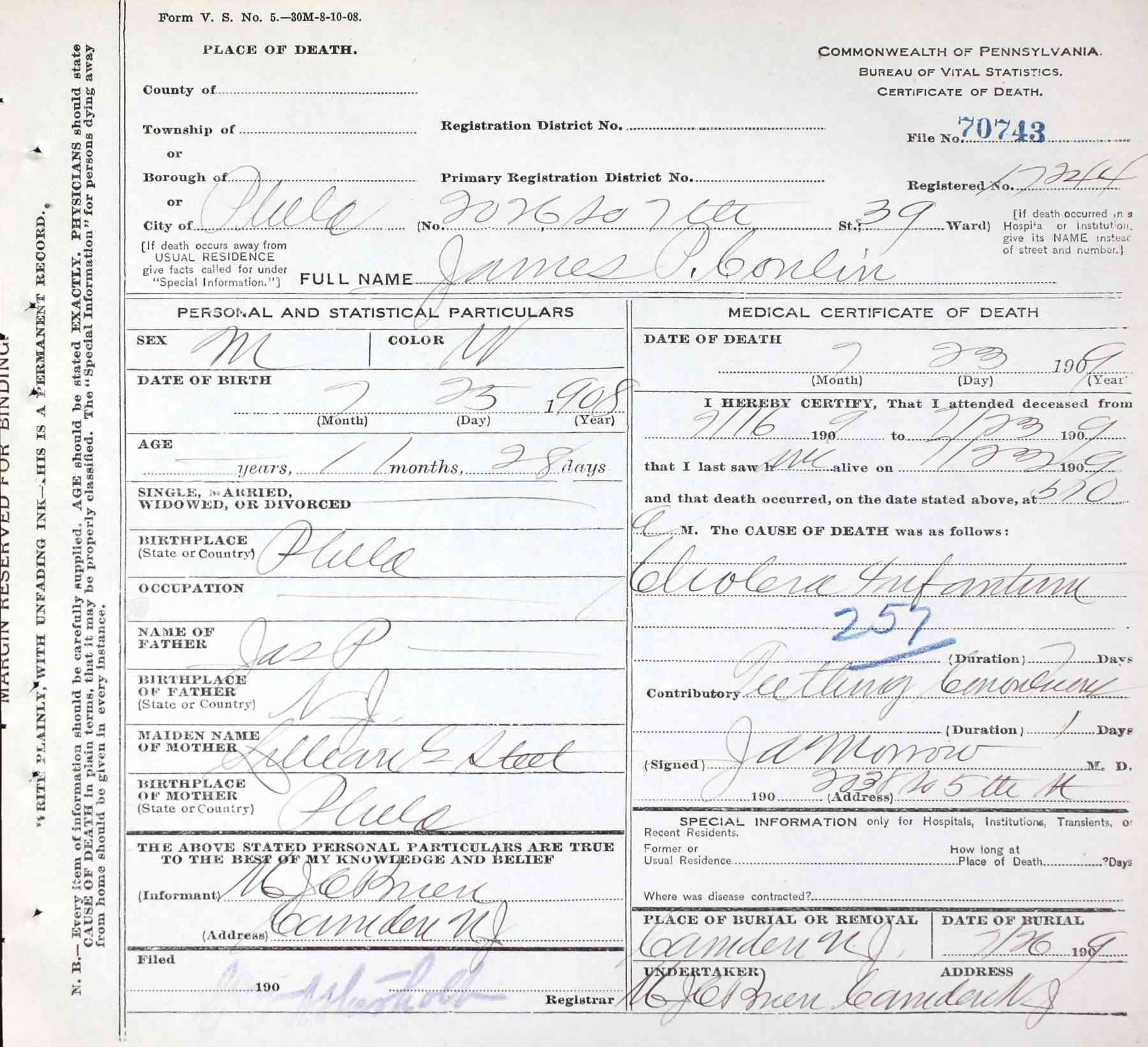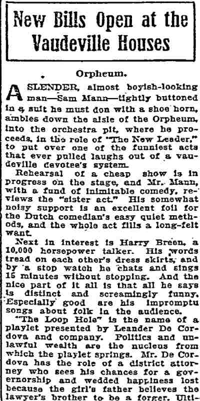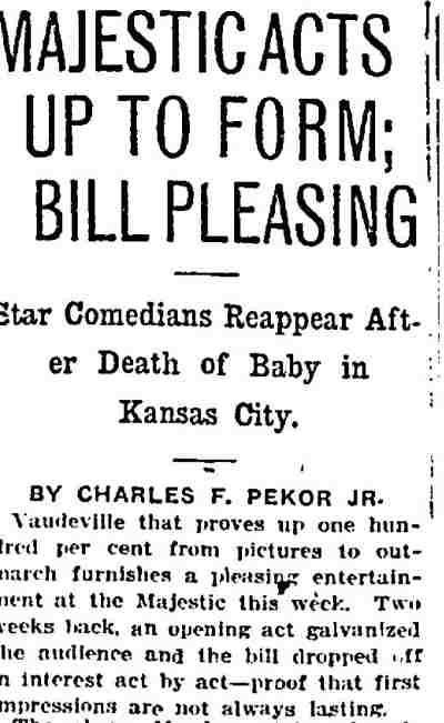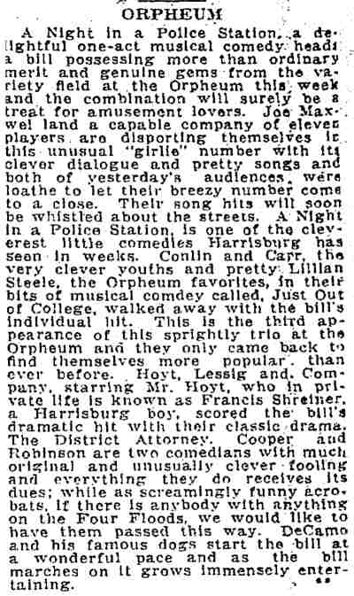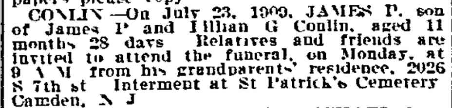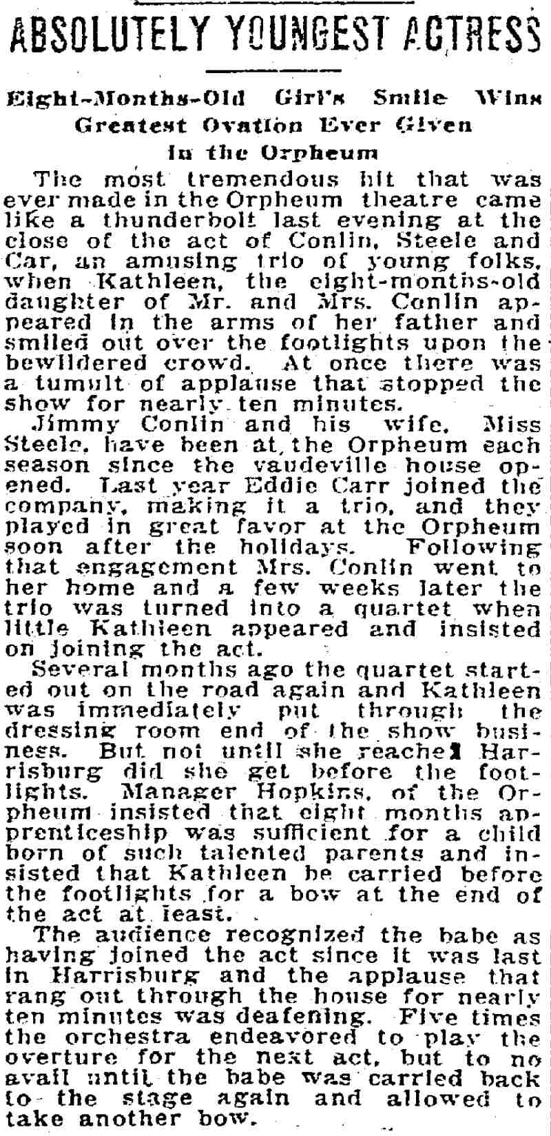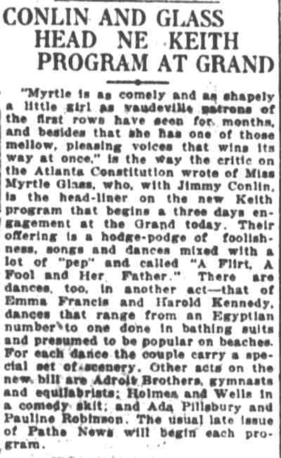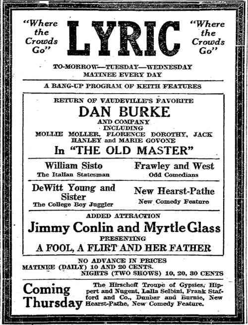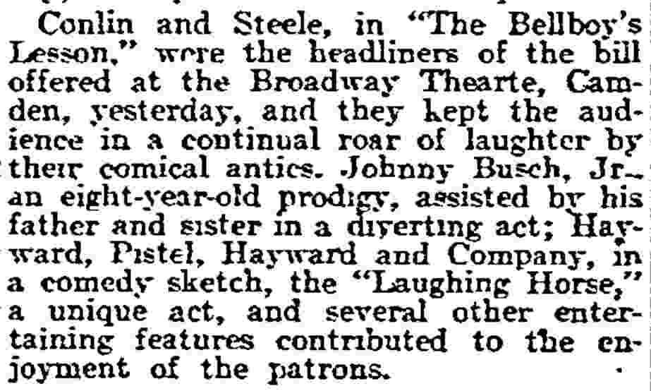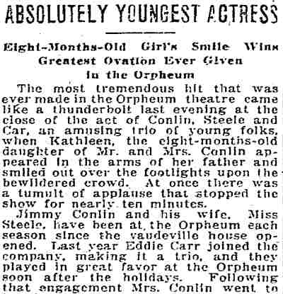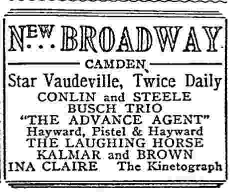 JIMMY CONLIN was born James Patrick Conlin in Camden, New Jersey on October 14, 1884. He was one of nine children born to William Conlin and his wife, the former Catherine "Kate" Manning. His father was a shoemaker. The Conlins had come to Camden in the 1870s. Son Charles was born in Camden in January of 1876. The 1878 City Directory shows the Conlins at 233 Taylor Avenue. When Jimmy Conlin was born the family lives at 211 Taylor Avenue. His father had opened a shoe factory at 104 South 2nd Street. The Conlins moved to 521 Taylor Street shortly before the 1890 Camden City Directory was compiled, and remained there into 1895, when they moved to 836 Federal Street, where they stayed as late as 1897. In that year his father and brother John J. Conlin moved the business, now called William Conlin & Son, to 238-240 Liberty Street. William Conlin and family moved to 222 South 5th Street, then returned to the 800 block of Federal Street, where they are listed in the 1898, 1899 and 1900 Coty Dirrectories at 822 Federal. The Conlin family had been fairly well off. Young Jimmy was given piano lessons and, as his father wanted him to be a concert pianist, was studying at the Philadelphia Conservtory of Music. As Conlin himself related in an interview late in life, when the business failed, the lessons stopped. Jimmy Conlin's next step was to seek out a career in show business. The 1900 Census shows Jimmy Conlin and his Conlin family at 822 Federal Street in Camden. Six of the nine Conlin children were still alive, and four of them were living at that address. The family included his parents, older brothers Daniel and Charles, widowed sister Mrs. Margaret [Mary] Mullane and her son Leo, and a thirteen-year old cousin, Catharine Manning. Older brothers John J. Conlin and Frank had wed and moved out on his own in the 1890s, they moved to Lancaster, Pennsylvania in the 1900s and went into the shoe manufacturing business. 1903 and 1904 Directories show William and Kate Conlin at 43 North 21at Street in East Camden. By 1910 William Conlin had passed away and Kate Conlin had moved, along with son Daniel and grandson Leo Mullane, to Lancaster, where they lived with daughter Margaret, her husband Paul Steiner and their two sons. Kate Conlin died during the 1910s. After learning his craft playing in traveling medicine shows, Jimmy Conlin graduated to better things. From the late 1900s though the 1930s he worked in vaudeville on the Keith-Albee and Orpheum circuits (Keith-Albee-Orpheum after 1927, Radio-Keith-Orpheum after 1928). In 1907 he married Lillian G. Steel, a fellow performer, and the two performed together for several years. When not on the road the young couple lived at 2026 South 7th Street in Philadelphia, Pennsylvania with her parents, Josiah and Nellie Steel. The Conlins had two children, daughter Kathleen Grace and son James P. Conlin Jr., born July 25, 1908. Sadly, James Jr. died of "cholera infantum" brought on by teething two days short of his first birthday. Funeral arrangements were handled by Camden undertaker Martin J. O'Brien and the young lad was most likely buried at St. Patrick's Cemetery in East Camden. The 1910 Census shows them living with his wife's parents, at 5545 Pemberton Street in Philadelphia. Freom 1907 into 1910, Jimmy and Lillian, billed as "Conlin and Steele", are known to have appeared as the old Bradway Theatre in Camden, on vaudeville stages in Philadelphia, central and eastern Pennsylvania, Trenton, and several cities in northern New Jersey, and may have worked farther afield. By the end of 1910 they had brought Eddie Carr into the act. In the latter part of 1911, Jimmy Conlin and Lillian Steele toured the Western states with their parner Eddie Carr. Billed as Conlin, Steele and Carr, they appeared in Seattle, Portland, and San Francisco in September, and in Salt Lake City and Denver in November. Daughter Kathleen, who traveled with her parents as they played at theaters across the country, died in Kansas in 1915. The Conlins separated, and in 1916 Jimmy Conlin began working with Chicago-born singer Myrtle Glass. Lillian Steele was granted a divorce in Philadelphia in March of 1917. Jimmy Conlin married Myrtle Glass shortly thereafter. Jimmy Conlin and his second wife continued to play the Keith-Albee and Orpheum circuits, billed as "Conlin & Glass", a song and dance team. By the summer of 1928 they were making their home, while not on tour, on Long Island in the town of Freeport, New York. They appeared in Australia and most likely also in New Zealand in October of 1928, returning to the United States aboard the S.S. Sonoma, arriving in San Francisco on November 15, 1928. They also starred together in two short films, sharps and flats (1928) and Zip! Boom! Bang! (1929) for Vitaphone. Conlin made another comedy short without Glass in 1930 (A Tight Squeeze). Jimmy and Myrtle Conlin appeared in Europe in the winter of 1931, returning aboard the ocean liner S.S. Ile de France, arriving in New York on February 24th of that year. Happily enough for you and I, Conlin's first film has been restored as part of The Vitaphone Project. Two clips from Sharps and Flats are, as of May 2017, available for viewing on Youtube, and a quite interesting review of the film, The Forgotten Sharps and Flats, was written in 2014. Scrawny, unprepossessing, and rustic-looking, the versatile comedian decided there must be some director who could use his gifts and he became a character actor. Mostly uncredited bit parts awaited him but occasionally there was a larger payday thanks to an occasional featured role. His film career