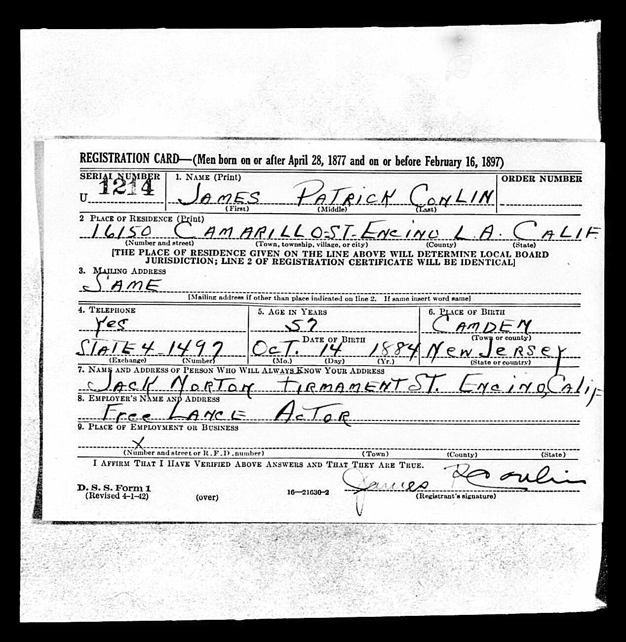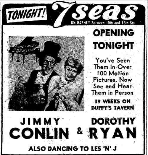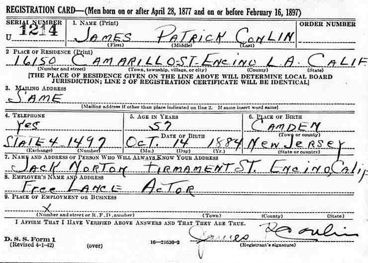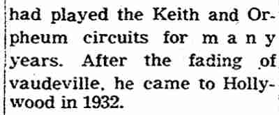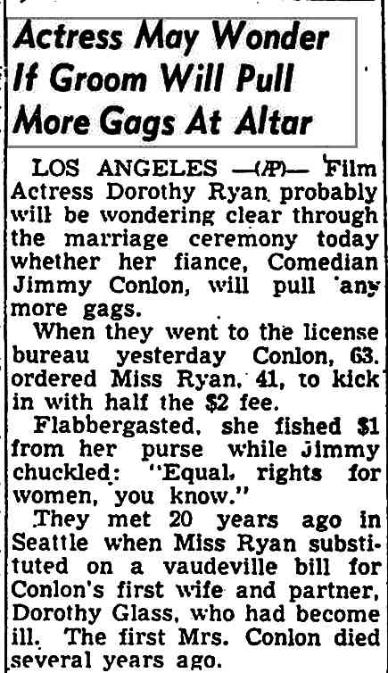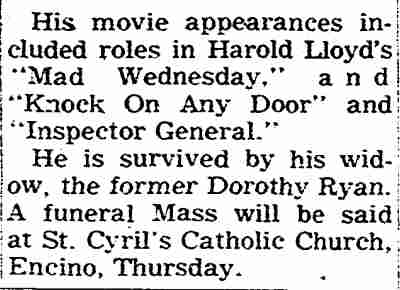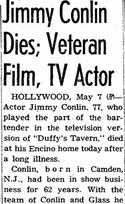 movie-goers of the day, his face certainly was. In the 1940s, Conlin was part of Preston Sturges' unofficial "stock company" of character actors, appearing in nine films written and directed by Sturges. His roles in Sturges' films were often sizable and often came with good billing. One of his best performances came in Sturges' The Sin of Harold Diddlebock in 1946, when he play "Wormy", the racetrack tout who convinces Harold Lloyd to have his first drink, setting off the events of the film. The loyalty between Sturges and Conlin ran both ways, and when the former golden boy of Hollywood fell on hard times, Conlin remained a friend, stayed in contact, and helped out in any way he could. Jimmy and Myrtle Conlin were living full-time in Los Angeles by 1935. The 1940 Cesus shows them living at 16150 Camarillo Street in Encino, California. Myrtle Glass Conlin passed away in Los Angeles on May 13, 1945. Jimmy Conlin remained at that address into 1952. Besides his work in movies, Jimmy Conlin continued to perform live on stage. In 1928 Jimmy Conlin and Myrtle Glass were working in Seattle when Myrtle took ill and was unable to go on stage. Also in Seattle that night was Dorothy Ryan of the sister act, Dorothy and Rosetta Ryan. Dorothy went on stage for Myrtle that night, and after her death, Jimmy Conlin revived his vaudeville act with Dorothy Ryan as his new partner. They were married in 1948. The couple appeared in small and medium-sized venues across the West and Midwest as late as June of 1960, when they played the King's Club in Dallas Texas. Jimmy Conlin also found work in the new medium, television. As stated above, he had a regular role as bartender in the show Duffy's Tavern. Jimmy Conlin was 75 years old when he bid farewell to the small screen with a fascinating guest-starring role on the series "Philip Marlowe," an episode called "Mother Dear" (released in December 1959). Also guest-starring in "Mother Dear" on this popular TV detective show based on the writing of Raymond Chandler was actor Franco Corsaro, who also had worked with Mae West, as the Italian officer in scenes for 1935's "Goin' to Town". Corsaro had also completed taping the "Around the World With Nellie Bly", an original musical comedy that aired on the NBC televison network on January 3, 1960. The show, which starred Janet Blair in the title role and Cornel Wilde, is especially interesting in that no less than 21 veteran character actors and actresses, each with over 100 screen credits, were cast in the many vignettes that comprised the show. In his final film role Jimmy Conlin played a habitual criminal in the 1959 film Anatomy of a Murder, with James Stewart, Lee Remick, Ben Gazzara, and George C. Scott, among others. Cancer claimed Jimmy Conlin. He died in Encino, California on Monday, May 7, 1962. He was 77. Survived by his wife Dorothy, he was buried at San Fernando Mission Cemetery in Mission Hills, Los Angeles County,California. |