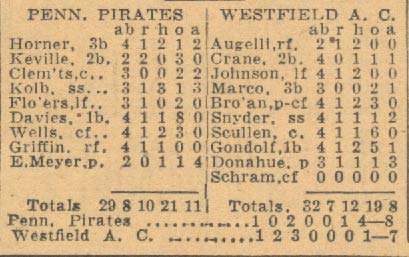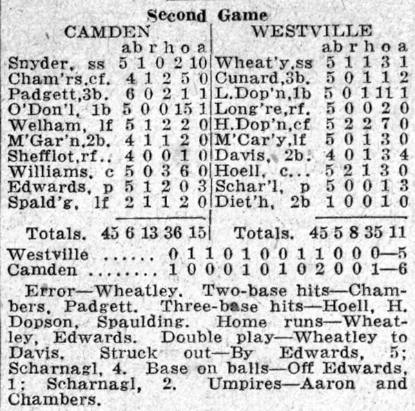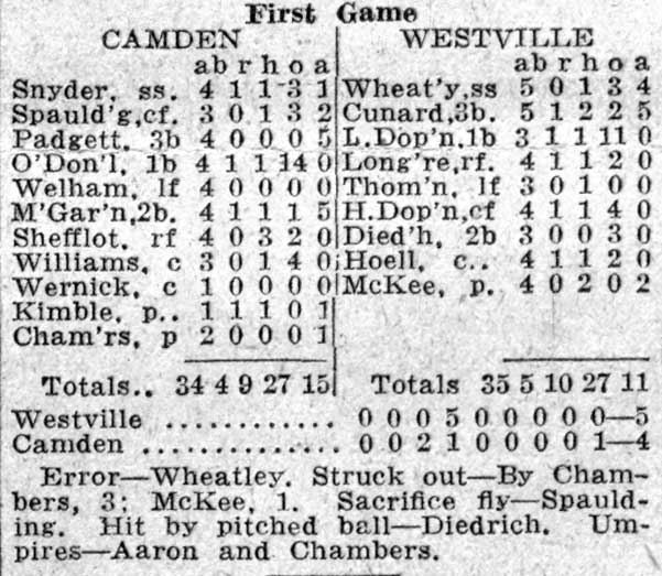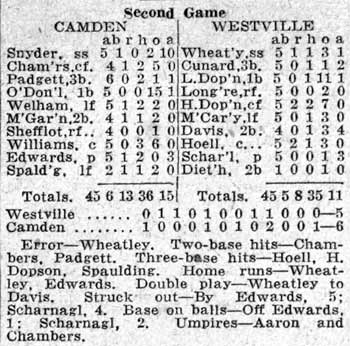 "Rube" Chambers then relieved Kimble and held the "Villagers" at bay during the balance of the game. Camden took the lead with two runs in the third and added another in the fourth. The locals' final marker came in the ninth.