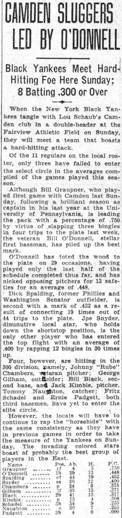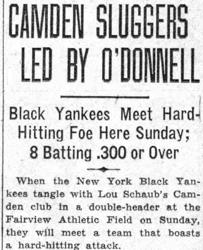 Probably the greatest collection of colored talent in the country will perform before local fans tomorrow afternoon at the Fairview Athletic Field when the New York Black Yankees and Lou Schaub's Camden Club engage in a double-header. The opening game is slated to start promptly at 2 o'clock.