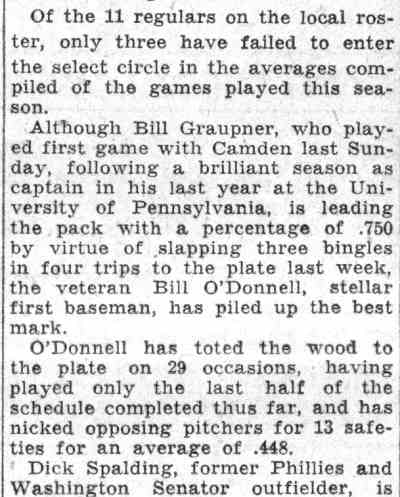 The local infield will be taken care of by Bill O'Donnell on first with Bill "Jigger" Black at second, and Joe Snyder at shortstop, while either Ernie Padgett or Fritz Schadel will hold down third base. In the outfield will be Dick Spalding , George Gilham and Bill Graupner, the latter having recently graduated from the University of Pennsylvania, where he captained the nine.