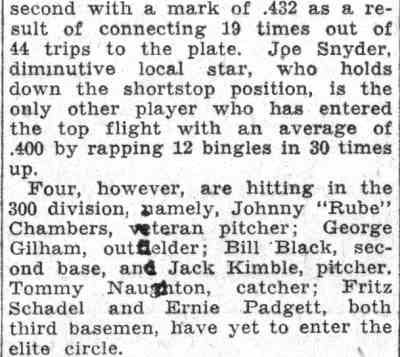 Then in the twelfth frame, Joe Snyder was hit by a pitched ball and went to second on Chambers' sacrifice. Snyder took third on Wheatley's error of Padgett's grounder and scored when Jack O'Donnell was safe on a fielder's choice.