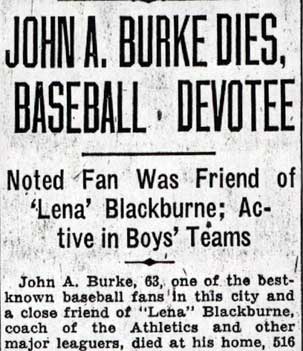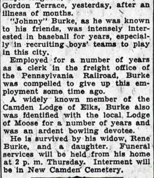 JOHN A. BURKE was born in 1875 in Pennsylvania. Known locally as "Johnny" he was a lifelong baseball fan, he was a close friend of Lena Blackburne, who played eight seasons in the major leagues, managed the White Sox for two seasons, and was a coach and scout for the Philadelphia Athletics for many years. He was quite involved in recruiting boys baseball teams to play in the numerous leagues in and around Camden. He was quite active with the Elks Lodge in Camden, along with Sergeant Ray Smith, and also was involved for some years with the Moose. At the time of the 1920 census he was living with his wife Rene and mother-in-law Susan Travis at 117 Pearl Street. He later moved to 516 Gordon Terrace, near the New York Shipbuilding Corporation shipyard. John A. Burke passed away on January 10, 1938. 63 at the time of his death, he was survived by his wife, Rene Burke, and a daughter. John A. Burke was buried at New Camden Cemetery. |