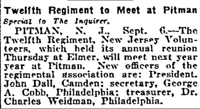 The following is a complete roster of this post for 1886 : Post Commander, Benjamin H. Connelly; Senior Vice-Commander, Adam C. Smith; Junior Vice-Commander, William Haegele; Surgeon, George Pfau; Chaplain, Samuel Gaul; Officer of the Day, Robert Crawford; Officer of the Guard, John D. Cooper; Quartermaster, Samuel J. Fenner; Adjutant, William B. Summers; Sergeant-Major, Stacy H. Bassett; Quartermaster-Sergeant, Otto K. Lockhart. Comrades: Philip Achenbach, George L. Allchin, Isaac Albertson, Joseph Applegate, John W. Barclay, Martin M. Barney, Joseph Baxter, William W. Bennett, Charles L. Bennett, Henry Bickering, Abel Biddle, George K. Biddle, John Bieri, Robert M. Bingham, Socrates T. Bittle, George W. Bittle, Benjamin F. Blizzard, Joseph Borton, Frederick Bowers, Benjamin M. Braker, john Breyer, William H. Brians, Wm. J. Broadwater, William Broadwater, John Brown, Harris Brooks, William H. Brooks, Joseph F. Bryan, Joseph Buddew, J. Q. Burniston, George Burton, Frederick Buser, Thomas L. Bush, William Butcher, Isaac B. Buzby, Edward C. Cattell, Joseph Cameron, James H. Carey, William Carey, James Chadwick, James Chafey, George M. Chester, James D. Chester, Lewis L. Chew, Henry S. Chew, John W. Churn, Andrew B. Cline, Charles Clarke, Samuel J. Cook, Levi E. Cole, John J. Collins, John C. Cooper, John W. Cotner, Thomas L. Conly, Harvey M. Cox, Jason S. Cox, Harris Crane, Charles Cress, Joel G. Cross, O. C. Cunningham, John A. Dall, John Dalby, John H. Damon, Westley Dare, John E. Dawson, Adam T. Dawson, James L. Davis, William Davis, Amos R. Dease, Henry Deford, Lewis F. Derousse, Michael Devinney, Glendora Devo, John Digney, Joseph Dilks, William A. Dobbins, George W. Dunlap, Aaron B. Eacritt, John J. Early, Christopher Ebele, Godfrey Eisenhart, John Elberson, Charles Elwell, Charles Eminecker, John Esler, John H. Evans, Charles S. Fackler, James Fanington, James A. Farraday, John H. Farry, John Faughey, Wm. H. Fenlin, George G. Felton, George W. Ferguson, Charles W. Fish, Israel L. Fish, James Finnan, Samuel B. Fisher, Edward L. Fisher, Ephraim B. Fithian, Jacob T. Fisher, Edward Fitzer, Samuel Flock, Leonard Flor, John Fox, John S. Fox, H. H. Franks, Chas. B. Frazer, Thomas J. Francis, Samuel W. Gahan, Chas. H. Gale, James Galbraith, Thomas Garman, Harry Garren, John W. Garwood, Josiah Garrison, John B. Gaskill, Richard Gaunt, Wm. German, Christopher Getsinger, Christopher Gifney, Jacob Giffens, Albert Gilbert, James Gillen, Wm. Giffins, C. C. Greany, Charles Green, W. H. Griffin, Louis Grosskops, William Grindrod, John B. Grubb, Mark H. Guest, John Guice, Alfred Haines, Charles G. Haines, Japhet Haines, George F. Hammond, Charles Hall, Solon B. Hankinson, Samuel P. Hankinson, James Hanson, Charles Hannans, H. A. Hartranft, Mahlon E. Harden, William F. Harper, George W. Hayter, Samuel B. Harbeson, J. T. Hazleton, H. Heinman, James Henderson, William H. Heward, Franklin Hewitt, James T. Hemmingway, Charles Hewitt, Edward K. Hess, Samuel B. Hickman, George Higgens, Ephraim Hillman, C. M. Hoagland, Guadaloupe Holl, William A. Holland, Isaac K. Horner, Count D. G. Hogan, William H. Howard, Baxter Howe, Alien Hubbs, Charles G. Hunsinger, Presmel D. Hughes, I. N. Hugg, Sebastian Hummell, Edward Hutchinson, C. Innes, Alfred Ivins, Benjamin Ivins, E. G. Jackson Sr., E. G. Jackson Jr., Thomas Jameson, George Jauss, William P. Jenkins, James L. Johnson, Alfred Jones, B. F. Jones, William Joline, Charles Joseph, Charles Justice, C. H. Kain, E. E. Kates, Benjamin Kebler, Frank Kebler, Peter Keen, Henry N. Killian, J. W. Kinsey, C. H. Knowlton, Thomas W. Krips, Joseph H. Large, John E. Leake, John Lecroy, Charles Leonhart, George W. Locke, E. J. Long, Charles L. Lukens, J. H. Lupton, Valentine Machemer, Edward Macloskey, Edward A. Martin, William P. Marsh, John Mapes, William Mead, William Metcalf, E. A. Meyer, C. Meyers, George Meilor, C. A. Michener, William B. E. Miller, Jacob Miller, W. D. Miller, Samuel Mills, William W. Mines, Christopher J. Mines, George Molesbury, William. Moran, Edward More, Richard Morgan, John F. Moore, S. H. Moyer, Jacob L. Morton, John Muir, John J. Murphy, Isaac Murray, Charles Myers, W. H. McAllister, James McCracken, Edward C. McDowell, Hugh McGrogan, H. M. Mcllvaine, W. F. McKillip, W.J.McNeir, Lewis McPherson, E. McPherson, Jacob Naglee, William Naphas, Antonio Nosardi, Robert O'Keefe, John S. Owens, Robert Owens, Edward H. Pancoast, James Pancoast, Robert B. Patterson, William Patterson, E. W. Pease, John B. Pepper, Joel Perrine, John Peterson, D. E. Peugh, Frederick Phile, Samuel B. Pine, William M. Pine, Adon Powell, John Powell, John Portz, J. B. Prucelle, John Quick, S. E. Radcliffe, Isaac C. Randolph, James A. Regens, Philip Reilly, Charles P. Reynolds, Alexander Rhodes, Benjamin F. Richard, Andrew Ridgway, Benjamin Robbins, Edward C. Roberts, James Roberts, Richard J. Robertson, William B. Robertson, Isaac Rogers, John Rogers, William H. Rogers, Thomas G. Rowand, Sebastian Schaub, Maurice Schmidt, Christian K. Schallers, James Schofield, George W. Scott, John E. Scott, John M. Shemelia, Edward M. Siemers, John Simmons, Benjamin F. Shinn, Thomas Sheeran, James Shield, Charles Smith, George H. Smith, William W. Smith, Charles S. Small, Adolph Snow, W. Souder, Francis Senders, Robert Sparks, David C. Sprowl, Alfred L. Sparks, Abraham Springer, George W. Stewart, William L. Stevenson, Thomas G. Stephenson, Samuel R. Stockton, Thomas Stockton, Thomas H. Stone, Henry Strick, E. J. Strickland, Charles String, George F. Stull, George W. Swaney, Crosby Sweeten, William F. Tarr, William A. Tatem, Thomas S. Tanier, George Rudolph Tenner, Charles L. Test, Leonard Thomas, Benjamin Thomas, Henry C. Thomas, George F. Thorne, Wesley Thorn, Thomas W. Thornley, Alexander W. Titus, Joseph Tompkins, J. E. Troth, Isaac C. Toone, Samuel Tyier, Jacob M. Van Nest, Albert Vansciver, Joseph Wakeman, Theodore F. Walker, Charles Walton, George Walton, Joseph Welsh, David Watson, Geo