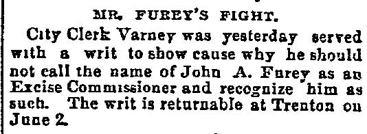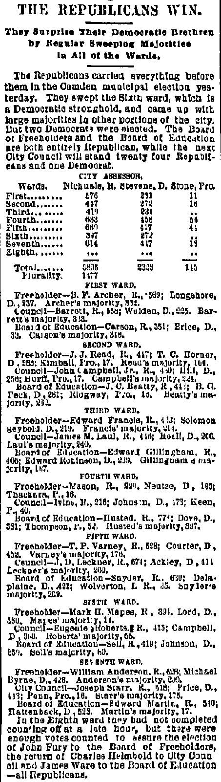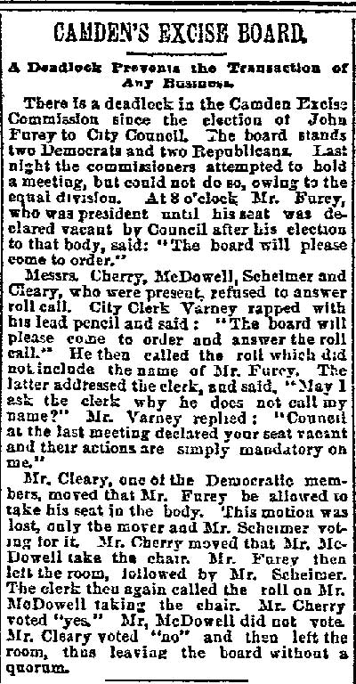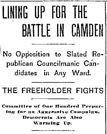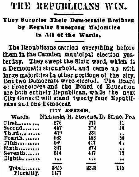 These "true Republicans" in a statement to the party rank and file, under the Algeresque title of "Now or Never," scathingly said: "It becomes the duty of every Republican voter of Camden county, who has the future interest of the party at heart, to administer a severe and lasting rebuke to all candidates who employ the element and encourage the means that were used in controlling the Sheriff's convention at City Hall, Gloucester City. It discounted anything within the memory of the oldest Democrat inhabitant. What with Col. Joseph Nichols urging the crowd to go elsewhere and nominate Gibbs, and the immaculate Billy Warner of the Fifth ward ordering them to burst the door in, coupled with the commanding voice of that great patriot and life-long Republican, James M. Scovel, alias Mountain Partridge, together with the curses and threats from John Furey, Jack Quigley, Pud Young, Bill Derr, "Tar Heel" Jim Hayes, the able city solicitor, and a gang of Philadelphia roughs, a beautiful spectacle was presented."
