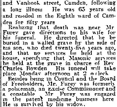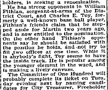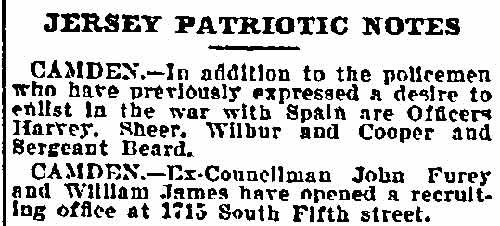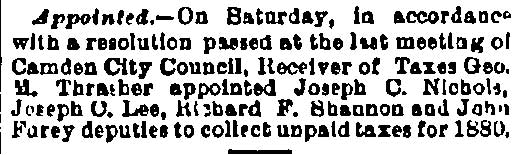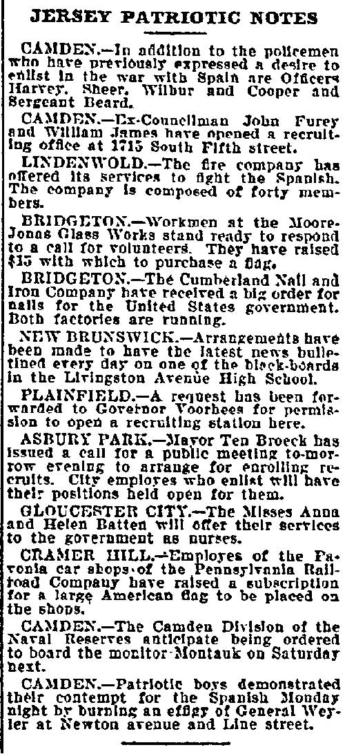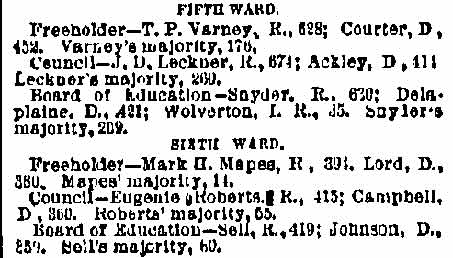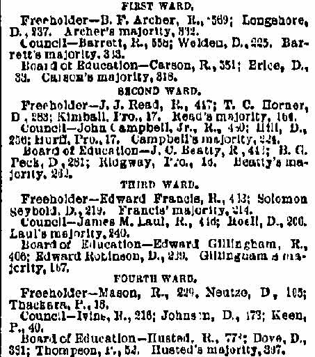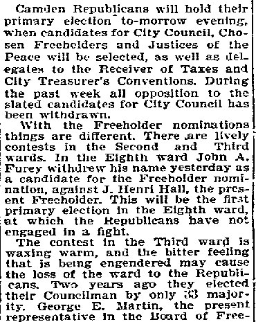 And all 29 of these valiant Republicans voted for Eli B. Morgan as their candidate for sheriff. You old timers will be interested in recalling these delegates who refused to kowtow to 'Colonel Jim.' In the Third ward there was James M. Lane, Charles S. Cotting and George Martin, in the Fourth, Husted, the Sixth, C. C. Smith, Thad Varney, Charles A. Sawyer: in the Seventh, Stephen Walters, Charles Lederman, William Simpson; in Gloucester, John W. Wright, David Anderson, Frank Mills, Robert Lafferty, Richard Allen, Jesse Daisey, Samuel Wood; in Haddon, Charles M. Macready, Elwood J. Haines in Delaware, William Brick, William Graff, Isaac Coles; in Merchantville, Matthias Homer, William Naylor, and in Center, James Davis, Garrett Patton and Gilbert Shaw.