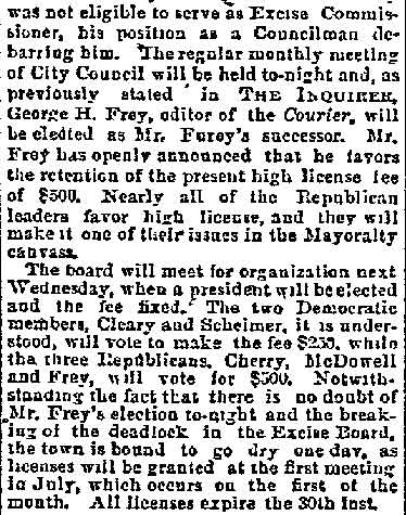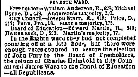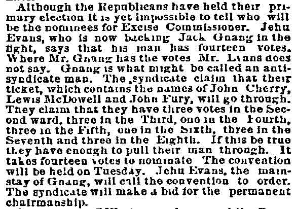 In the shrievalty scrap of 1881, Gibbs received 5381 and Morgan, 1189. Angus Camerson, the Democratic candidate was given 4450 votes. Nor did the "true" nominees for coroner fare any better. Sam Bennett, William Thompson and Alexander Powell being defeated by 'Doc' John D. Leckner, Jacob Justice and William Duble.