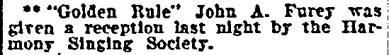 But the "true" Republicans licked their wounds and most of them were ready to "yen their heads off" when Colonel Scovel in later campaigns made the welkin ring with his call from the rostrum to wallop the enemy. If you now come across any of the few actors of that period still in the flesh an allusion to that "spectacle" of half century ago will sure bring one big chuckle with the declaration "them was the days."