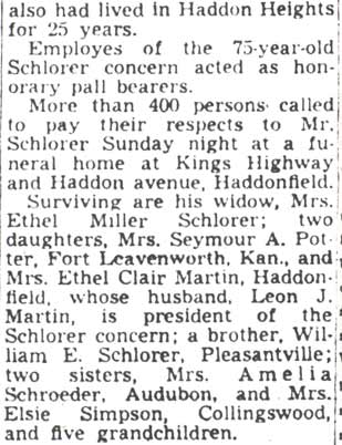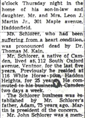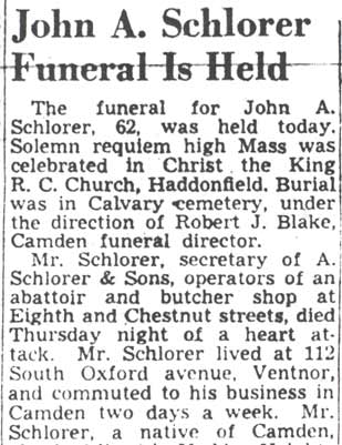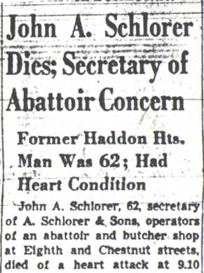 JOHN A. SCHLORER was born in Camden NJ on December 10, 1889. His father, Adam Schlorer had established a meat business in 1883. John Schlorer would remain with the family business, A. Schlorer & Sons, his entire life. The business was originally at Second and Arch Streets, moved to 800-804 Chestnut Street in 1888, and would remain there into the 1950s. John Schlorer's early years were spent at 415 Chestnut Street in Camden. His Uncle Edward Schlorer, also a butcher, lived next door at 413 Chestnut. He moved to Haddon Heights NJ around 1920. He was still living there, at 116 White Horse Pike, in 1933. John A Schlorer moved to Ventnor NJ about 1945. John Schlorer suffered a fatal heart attack while visiting his daughter in Haddonfield NJ in July of 1950. He was buried at Calvary Cemetery in what is now Cherry Hill NJ. |
