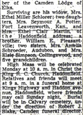 Members of Camden Lodge of Elks held services last night. He services today were conducted by Reverend J.W. Ohl, rector of the P.E. Church at Collingswood. The body was interred in Colestown Cemetery.