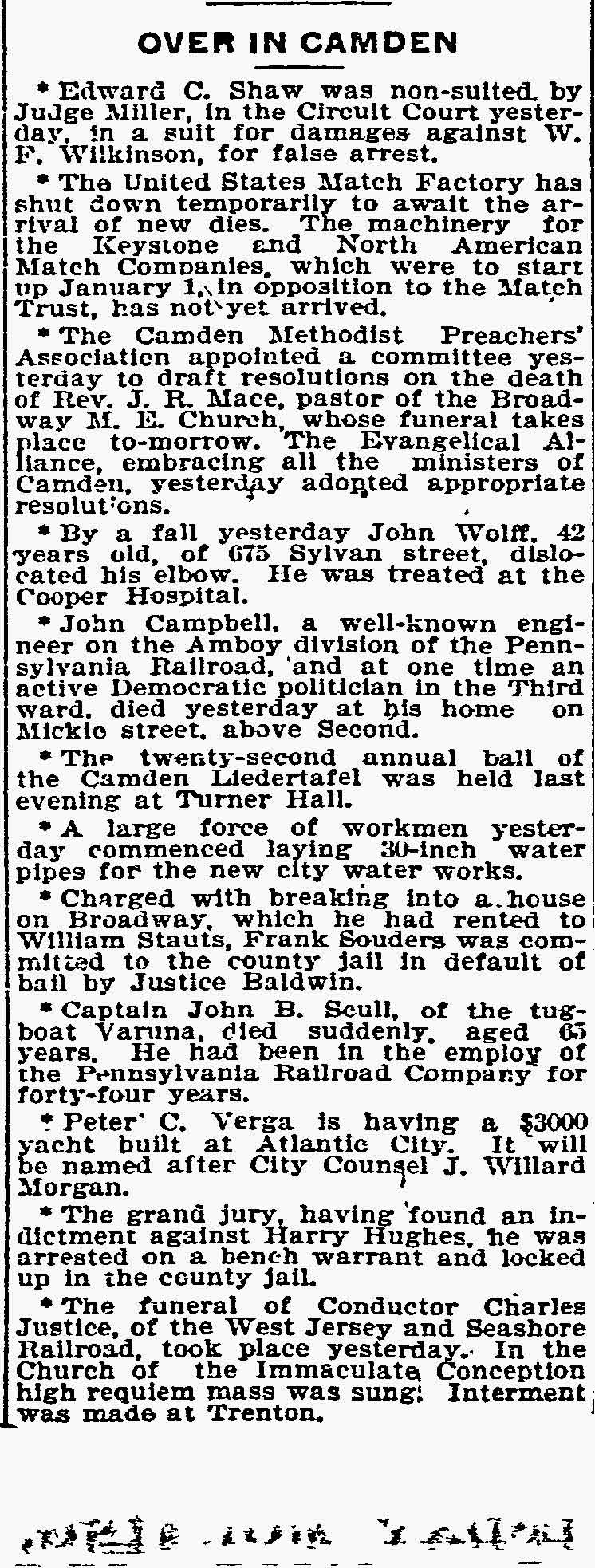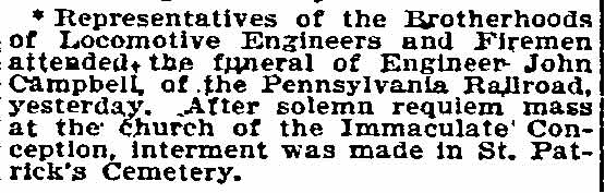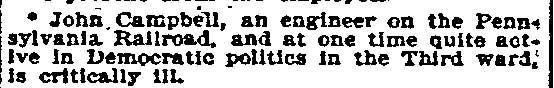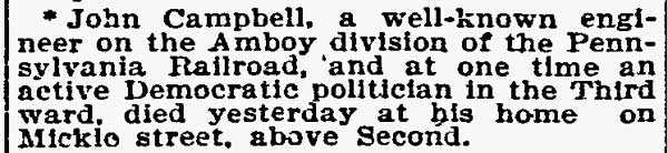 As to who John Campbell was prior to joining the Fire Department and what became of him after he left is unclear, as there were several men named John Campbell in Camden during this time. His obituary states that at one time he was politically active as a Democrat from the Third Ward. What is known is that when John Campbell was first appointed to the Fire Department he was living at 428 Spruce Street. The 1881 City Directory and fire department records from 1882 indicate that he was working as an engineer, that is, operating steam equipment, and living at 230 Taylor Avenue. He was still residing at 230 Taylor Avenue in 1883. He then was working as a moulder. He was still at that address in 1884, and had gone to work as an engineer for the Pennsylvania Railroad. He had moved to 201 Taylor Avenue by 1887. The 1892-1893 and 1893-1894 Directories show him living at 12 South 2nd Street. He moved to 217 Mickle Street prior to the compilation of the 1896 City Directory. John Campbell was reported as being critically ill in December of 1896. He passed away at his home on Mickle Street on January 18, 1897. |