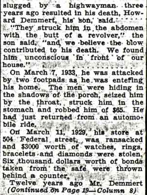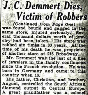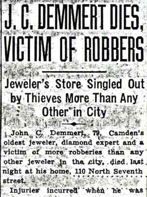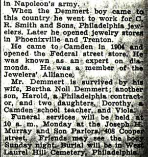 JOHN C. DEMMERT was born in Germany around 1857. His father Christian Demmert, was a jeweler, and with uncle August Demmert controlled South African diamond imports in Central Europe at one time. He came to America in 1875, and became a citizen in 1880, taking a position with a jeweler in Philadelphia. He married Bertha Noll about this time. Going into business for himself, he operated a store in Phoenixville PA. By March of 1890 he had purchased the jewelry store of Charles Stakeman, at 23 East State Street in Trenton NJ. He took a break from the Jewelry business in 1895 and moved to Medford NJ, where he operated a hotel through at least 1898. He came to Camden in 1904. A recognized expert in diamonds, John C. Demmert opened up a jewelry store at 504 Federal Street upon arriving in Camden. He remained at that location through at least 1929, before moving his shop to 216 Broadway. During his tenure in the jewelry business, John C. Demmert was robbed six times. On March 7, 1933 he was mugged outside his home at 110 North 7th Street. His family believed that a blow to the abdomen during this incident contributed to his death three years later, on August 13, 1936. He was survived by his wife Bertha, sons Howard and Harold, and daughters Dorothy and Viola. John C. Demmert was buried at Laurel Hill Cemetery in Philadelphia PA. Bertha Dorothy and Viola Demmert were still living at 110 North 7th Street as late as 1947. Viola Demmert had remained in the jewelry business, conducting a shop at the 110 North 7th Street address selling gold, diamond and tungsten jewelry, while Dorothy Demmert was at that time a teacher at the George Washington Elementary School in the Cramer Hill section of Camden.. |
