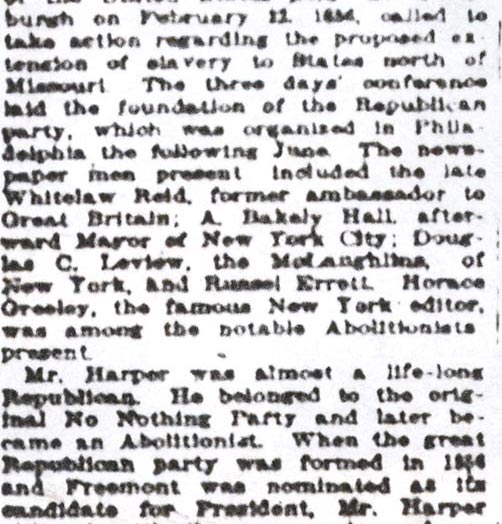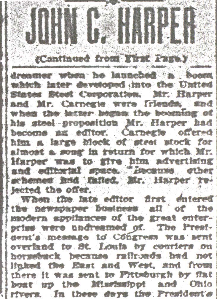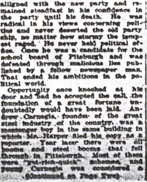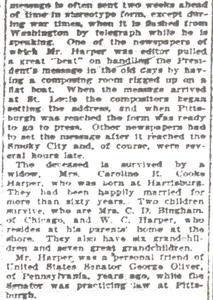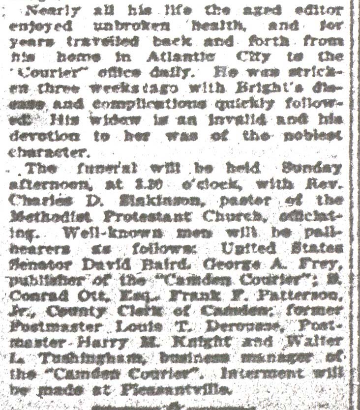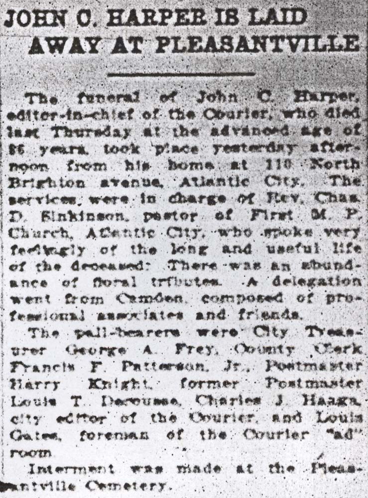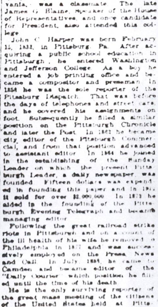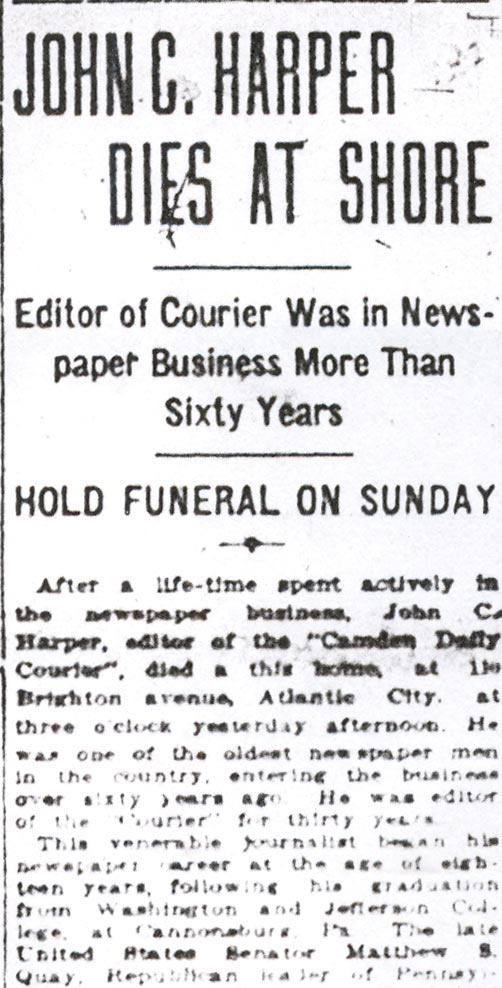 JOHN C. HARPER was the son of John Harper, an Irish immigrant who was born born September 15, 1799 in Ballymeena, and Nancy French, born in Ireland in 1811. John C. Harper was the oldest child, born in Pittsburgh PA on February 10, 1833. He was followed by brothers William and Samuel and sisters Nancy and Margaret, two other sisters died as infants. His father passed in April of 1846, his mother however lived to be 90, passing in Pittsburgh in 1901. After attending public schools in Pittsburgh John C. Harper entered Washington and Jefferson College. By 1854 he was working as a reporter. In 1864 he co-founded the Sunday Leader which evolved into the Pittsburgh Leader. He stayed in Pittsburgh until 1877, when the ill-health of his wife gave him cause to move to Philadelphia. In 1884 he came to Camden to assume the position of editor of the Daily Courier, a position he held until his death on May 9, 1918. He was survived by his wife Caroline, daughter Mrs. Annie Bingham, son William, and his younger sister Margaret. A keen judge of talent, John C, Harper hired S. Conrad Ott as a reporter for the Daily Courier in 1889. By 1891, Ott, not yet 24 years old, was promoted to City Editor, a post he held until leaving journalism to practice law full-time in September of 1902. John C. Harper's brother William Harper was also a career journalist. William was working in California during the Civil War and worked for the San Francisco Call up until his death in 1882. Brother Samuel served in the Union Army before returning to Pittsburgh, where he passed in 1889. |