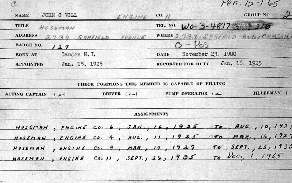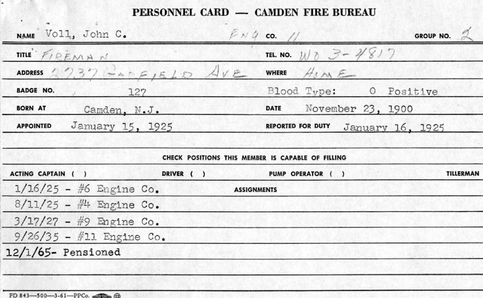 John Voll, Edward Peraria, howard gick, Captain Eli Hunt and George Townsend, firefighters from Engine Company 9, based on Twenty-seventh Street, take a moment together following a fire on a rainy night in December 1928, seen here in the first row from left to right. The blaze involved the offices of leon e. todd at 2623 Westfield Avenue. Todd was a realtor who helped develop Medford Lakes.